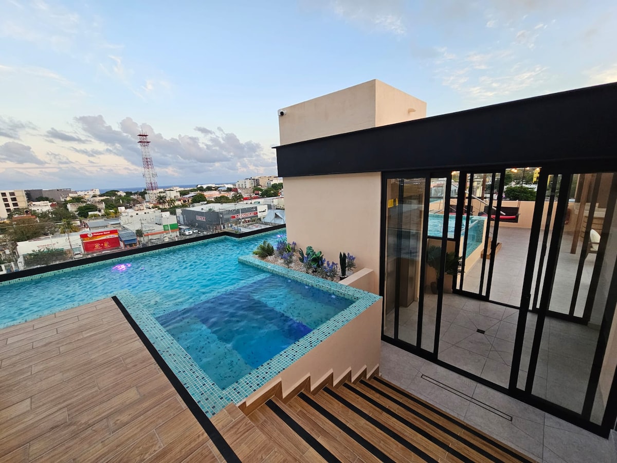 ¡Disfruta del lujo y la comodidad en nuestro departamento! Cuenta con 1 recámara elegante con vista al mar, de una terraza privada y amplia con vista espectacular. A pocos minutos caminando de la playa y la quinta avenida. Estacionamiento privado, seguro y gratuito. Rooftop con vista al mar Caribe, alberca, jacuzzi, Gym y baño de vapor. Cuenta también con lobby y su recepción y seguridad 24/7. ¡Reserva ahora y vive una experiencia inolvidable!