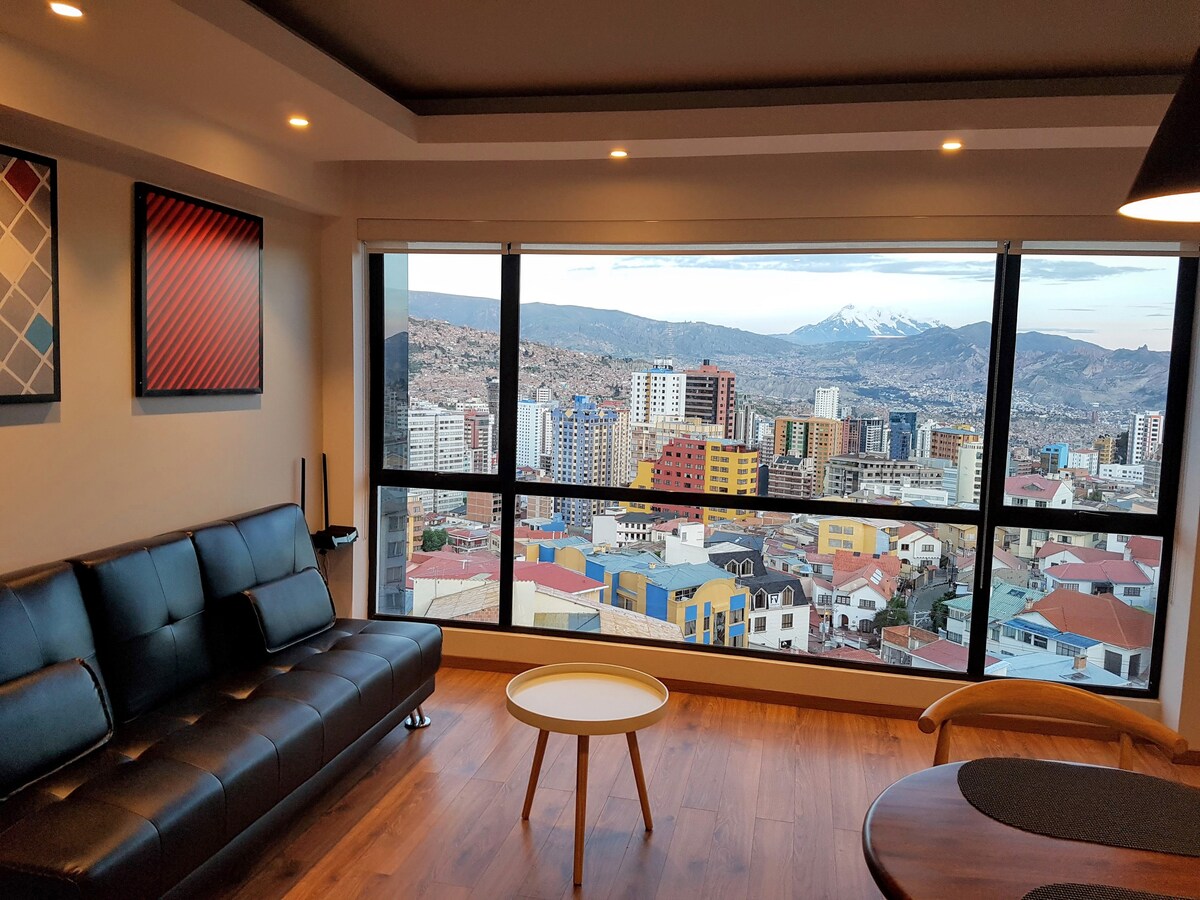 Penthause exclusivo con vista panorámica inigualable del "Illimani" y la ciudad. - Ubicado en el corazón de Sopocachi, cerca de supermercados, restaurantes y trasporte público. - Wifi 5G - Cocina independiente, Nexflix, lavadora y agua caliente. - Acceso seguro y privado con ascensores panorámicos y seguridad 24/7 1. Habitación principal cama QUEEN para 1 o 2 personas Dólares 38 (la segunda permanece cerrada) 2. Segunda habitación (opcional) cama doble disponible por 10 dólares por persona.