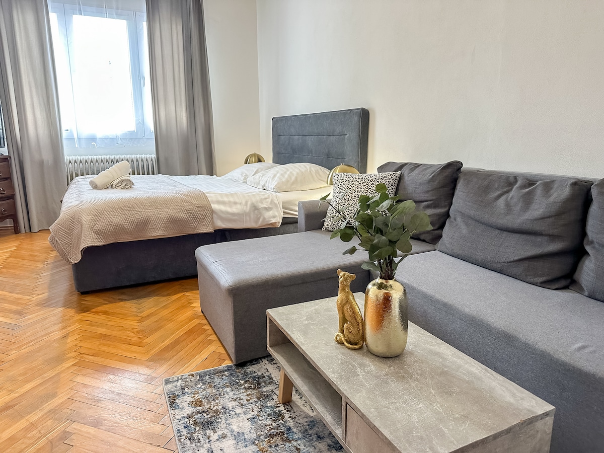 Apartamento elegante e espaçoso a poucos passos do centro da cidade (10 minutos a pé) e a apenas 2 minutos da estação rodoviária/ferroviária e do centro comercial Terminal. Localização tranquila e segura em um parque com parque infantil. Nas proximidades há lojas, restaurantes, cafés e outras comodidades da cidade e, ao mesmo tempo, ainda está a um pulo da natureza (Baixas Tatras, Veľká Fatra, Podpoľanie, Kremnické Vrchy - paraíso dos esquiadores). O apartamento está totalmente equipado para a sua experiência inesquecível em B.Bystrica.