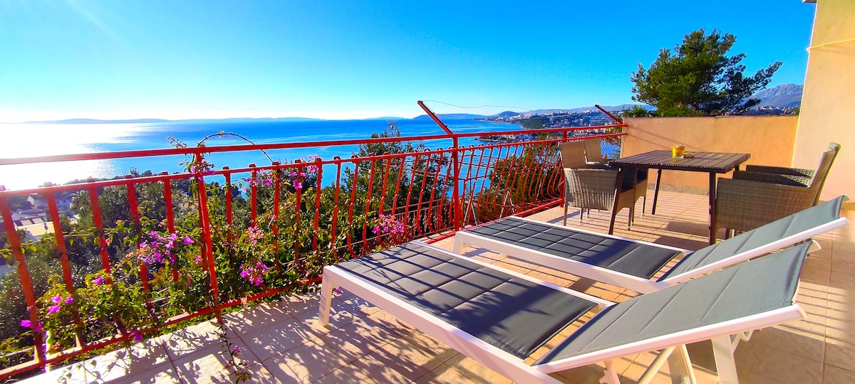 Whether you are looking for a romantic get-away or a family holiday our “ Magical Sunset” apartment can address your needs… This is an 80m2 penthouse apartment consisting of two bedrooms (one double and one triple), two full bathrooms, a fully furnished kitchen, living room with large sofa, and a spacious terrace with an amazing sea view. Open your 3 glass sliding doors and turn your terrace into a part of your living space! The apartment is tastefully decorated and very spacious with all the comforts we think you will need on your stay with us! The apartment suits 5 people comfortably. The terrace provides for a great place to have an evening dinner and watch the wonderful blues of the sea or the tremendous outline of Split. In the evening you can enjoy the sparkling lights of the Island while relaxing with your favorite drink! Our property is located on the beach and has direct access to the sea in a very relaxing and safe area. Best of all we are just 10m till you can touch the water of the Adriatic! Along the beach you will find a number of restaurants, bars, pizzerias and café’s offering typical Dalmatian food and beverage at reasonable prices. The nearest marina is a 5-min walk from the apartment thus allowing easy access to one of the nearby islands such as Brac or Hvar. Also along the beach within a 5 minute walk there is a large 5 star hotel and casino that also has an array of places to dine, enjoy a cup of espresso or just get an ice cream. The apartment has two air-conditioning units, satellite TV, DVD player, Wi-Fi Internet as well as its own parking space. The apartment has tile and hardwood laminate thru-out the unit and furniture that is very comfortable and relaxing. The first bathroom has an enclosed shower and the second bathroom has a bathtub/shower combination. The apartment comes with all the amenities you would need and comforts of home. -Complete cookware (pots, pans, bake ware, etc.) -Full size refrigerator, 4 burner stove/oven -Dishes, glasses, cups and cutlery and coffee maker -Bed linen and extra blankets - Complete set of towels - Two air conditioning units and window coverings - Terrace with table and 6 chairs - Retractable awning to cover terrace on hot days For those with a car, we are less than 10-min drive from Split, Dalmatian metropolis and Croatia's second largest town. Enjoy some of the sights, food, tradition and heritage of this great city! If a car is not your means of transportation then you can utilize the bus stop just across the street from our apartment. Buses run every half an hour and will take you to the very center of Split or other place along the coast like Omis, Makarska or Dubrovnik. The apartment is away from the crowds and the bustling area of Split but very easy access to this great city! We are located in a great spot serving you for a quiet and relaxing vacation. Yet, our convenient location serves as the perfect base for exploring Croatia's second largest city or other area’s along the coast. On our grounds we have a grassy area where you could sit on a blanket and have a picnic or use our traditional Dalmatian style grill to prepare your meals enjoying the taste of traditional Croatia. We provide beach lounge Chair, that will allow you the relaxation and comfort on the beach for sunbathing or for an evening sunset at the edge of the sea. We also have parasol to enjoy the beach and keep the sun away. We are proud to present you a number of apartments designed to suit the needs and budget of any guest visiting Podstrana on either business or pleasure. We are a family run business that has been renting out apartments for over 15 years and pride ourselves in providing the best guest experience along the Dalmatian coast. Beach - 10m Grocery shop - 100m Bakery - 80m Restaurant(s) - 50m Night club - 300m ATM machine – 300m Bus stop - in front of the house Airport - 25km Main bus and train station - located in Split – 10km