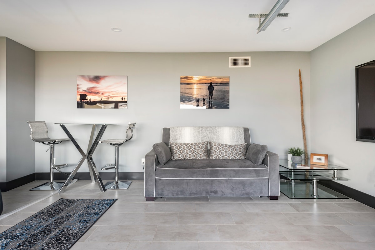 Just 2 blocks from the ocean, this modern space boasts the best of both worlds; nestled between the quiet, peaceful, Sunset Cliffs and lively Ocean Beach. This modern southern California beach home has 2 bedrooms, two full baths, and separate living room (4K 55” TV and high-speed gigabit fiber internet) / kitchenette with microwave, small fridge, coffee maker, toaster oven, and prep sink. Outdoor patio area with fire table to keep you cozy on cool evenings after a day of fun.