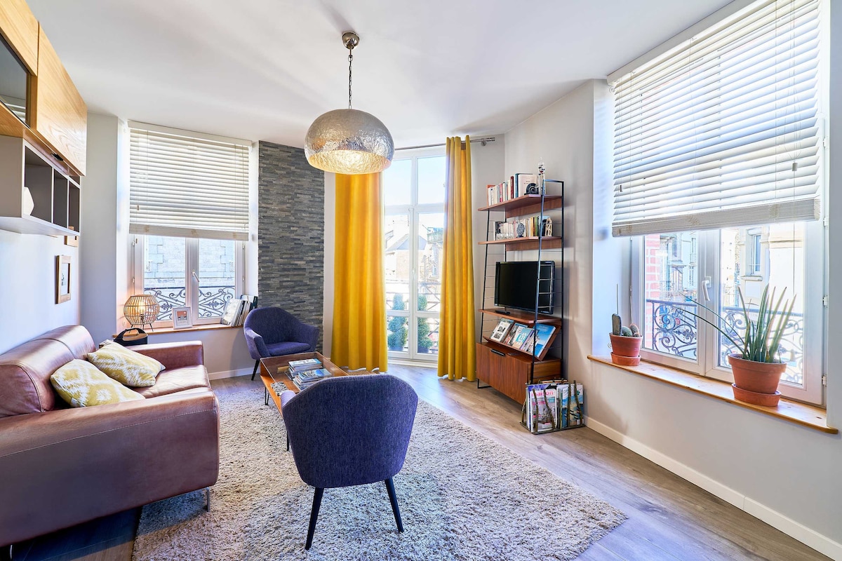 Conforto e charme para este apartamento de 43 m2 virado a sul, no 1º andar de uma casa Dinardaise de caráter, remodelado, em uma rua tranquila a 400 m da praia, lojas e mercado a uma curta distância a pé. Cozinha-sala de estar em estilo loft, 1 quarto + 1 área de dormir no mezanino, banheiro, Wi-Fi gratuito, estacionamento gratuito na rua. Para estadias de menos de 7 dias, uma opção de roupa de cama é possível (€ 10/1 cama de casal). Opção de limpeza padrão no final da estadia possível: (para ser visto no local em sua recepção).