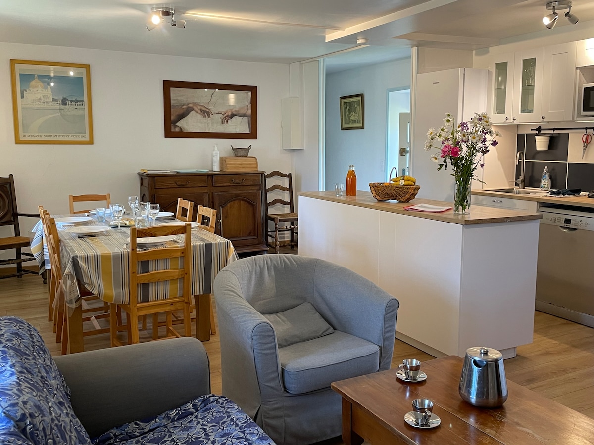 Apartamento de 30m2 localizado no 1º andar da pequena residência muito tranquila,composta por 1 quarto separado, kitchenette , sala de estar com sofá-cama e banheiro com banheira . Você pode desfrutar de seu pequeno terraço (3 m2) com mesa e cadeiras ,admirando o porto de Trevignon e a vista direta para o oceano e o Arquipélago de Glénan. Você vai desfrutar das praias ,das caminhadas ,da reserva de pássaros, das dunas a uma curta caminhada de distância . Restaurantes próximos,creperia ,café.
