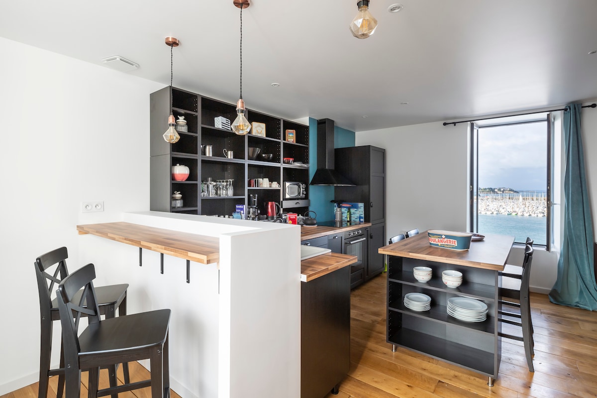 Duplex com belas vistas para o mar, o porto de Bas-Sablons e Dinard, 1ª fila para o pôr do sol no Cabo Frehel! Com uma área de 45 m2, composta por uma sala de estar e um quarto no andar de cima. Perto da praia de Bas-Sablons, lojas, restaurantes e mercado. Leva apenas 10 a 15 minutos a pé até a cidade e suas muralhas. Belas caminhadas na área circundante, como o Tour Solidor, a cidade de Aleth com a vista de Dinard, o porto de Bas-Sablons.