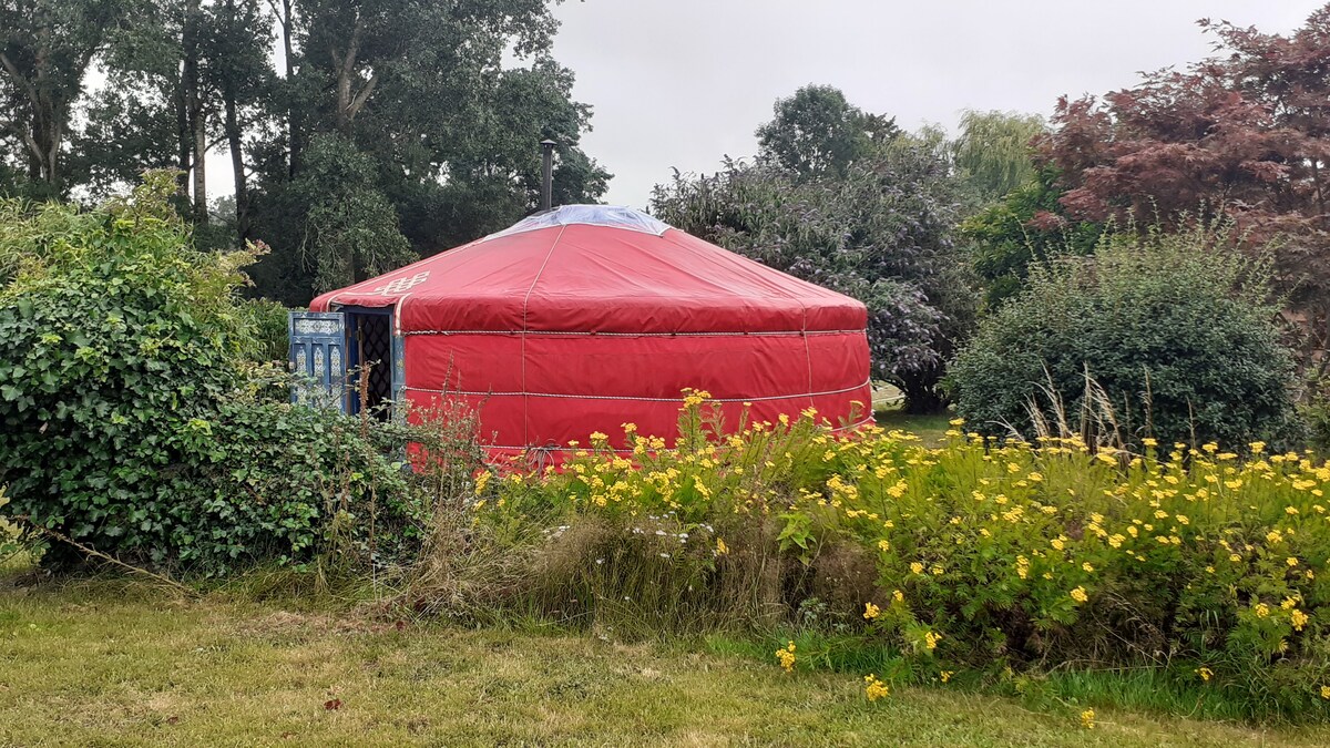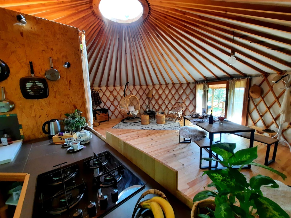 A yurt oferece quatro camas, duas camas de solteiro e uma cama de casal, uma área de cozinha (com um mini-forno e fogão elétrico), uma mesa de centro e uma mesa para refeições. A yurt tem 28 m² e oferece acomodações aconchegantes, perto da natureza. Ela é aquecida no inverno. O café da manhã será oferecido em uma cesta. Do lado de fora está o bloco sanitário com um banheiro privativo para o chuveiro e uma pia para lavar a louça, outro cômodo para o banheiro.