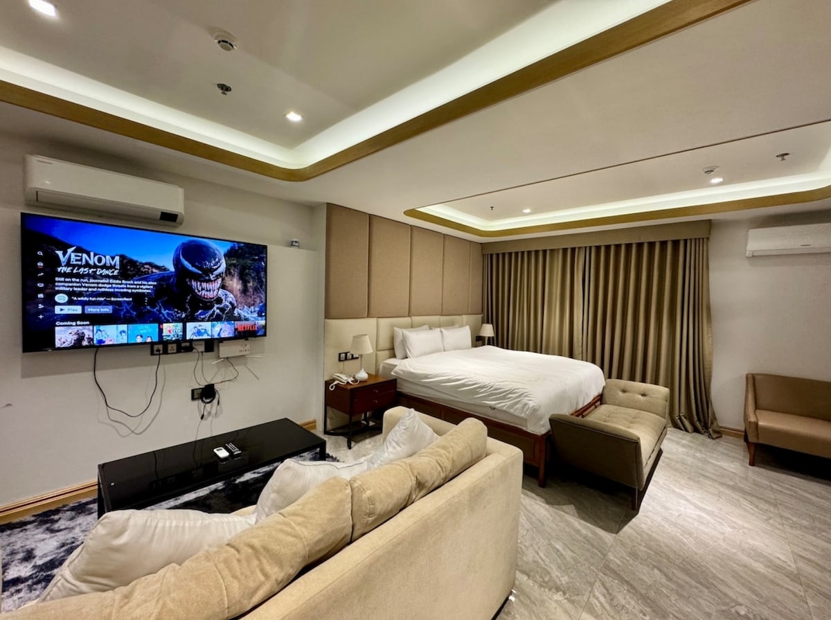 Você pode desfrutar de filmes e séries com TV de tela grande e sofá aconchegante neste quarto. Está localizado em um andar alto, por isso há menos ruído e boas vistas diurnas/noturnas. No telhado do edifício, você pode usar com segurança várias instalações, como academia, piscina e bar. Muito perto da Rua Vermelha (Rua de Caminhada) e do Cassino.
