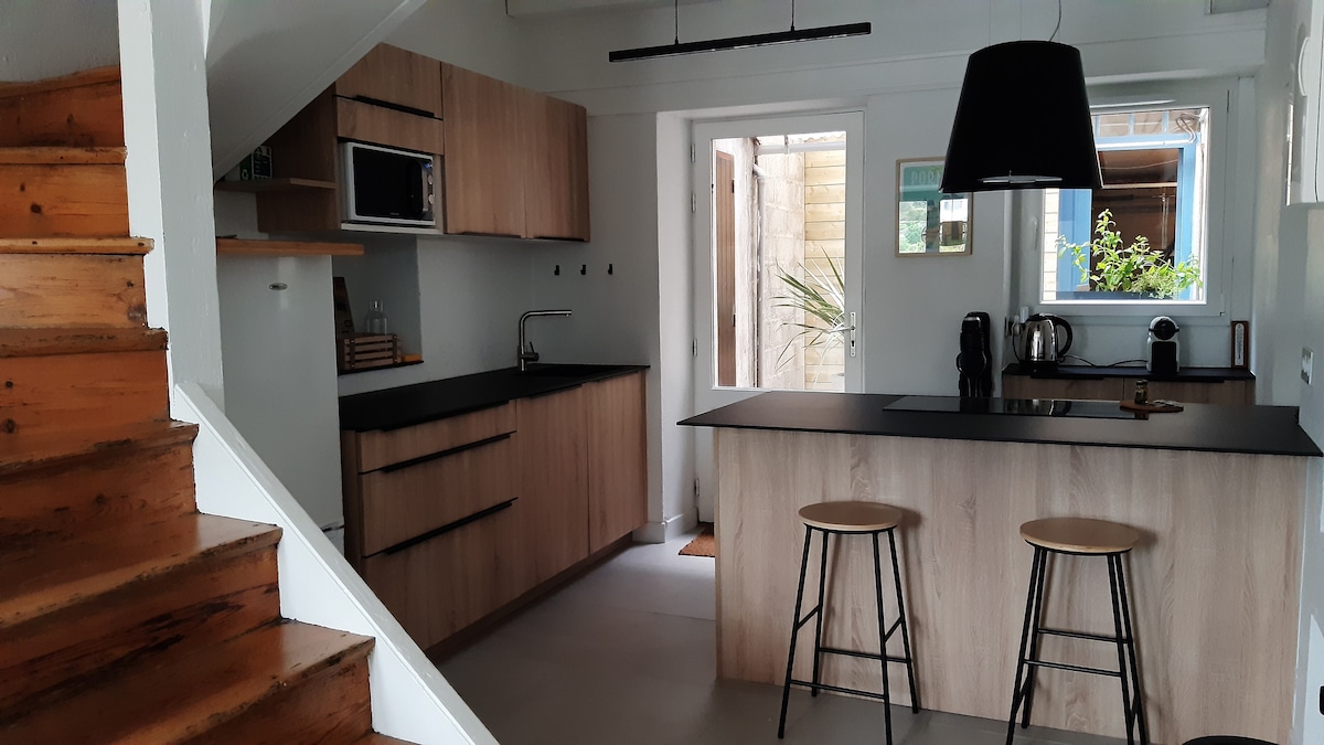 No coração de Pornic, bairro Gourmalon. Tudo é acessível a pé. Vila de 1900, composta no andar térreo por uma entrada, uma sala de estar/jantar, uma cozinha, uma despensa e um banheiro. No andar de cima, um quarto com cama de 140 x 200 cm com vista para o porto, um segundo quarto com cama de 140 x 190 cm, um terceiro quarto com duas camas (80 x 190 cm e 90 x 200 cm), um banheiro com chuveiro e vaso sanitário. Terraço OESTE com vista para o porto, jardim SUL Roupa de cama fornecida, camas feitas. Garagem para 1 carro e 2 bicicletas Aquecimento a gás da cidade, termostato