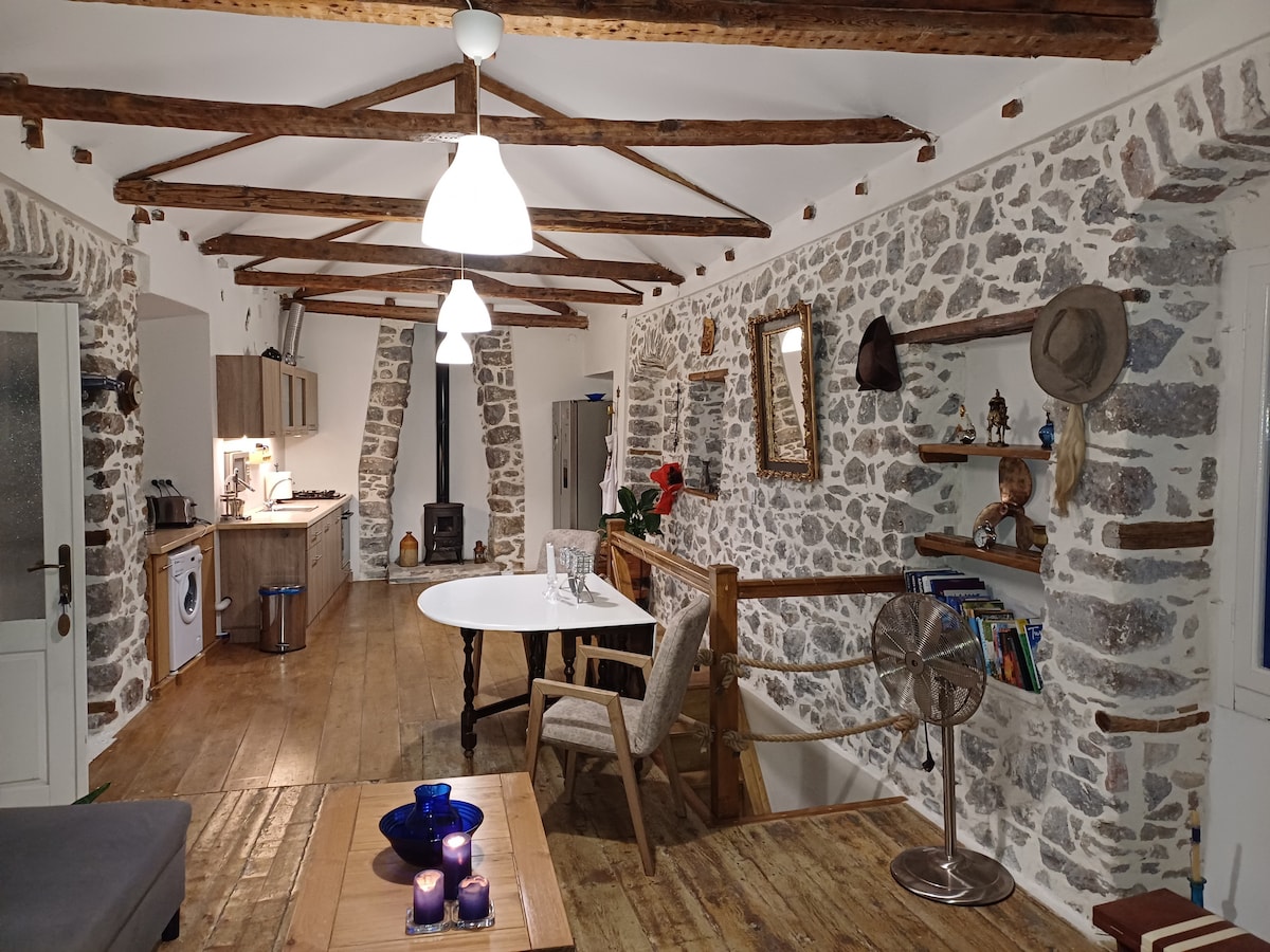 Chalé de pedra antiga em um terreno cheio de pinheiros ao lado do mar com acesso direto a uma pequena praia semi-privada. A poucos minutos a pé da casa fica a "Love Bay", uma das praias mais bonitas e bem organizadas das ilhas. A cidade de Poros fica a cerca de 3 km de distância (5 min de carro ou táxi), e a uma distância de menos de 800 m da casa há 4 tavernas.