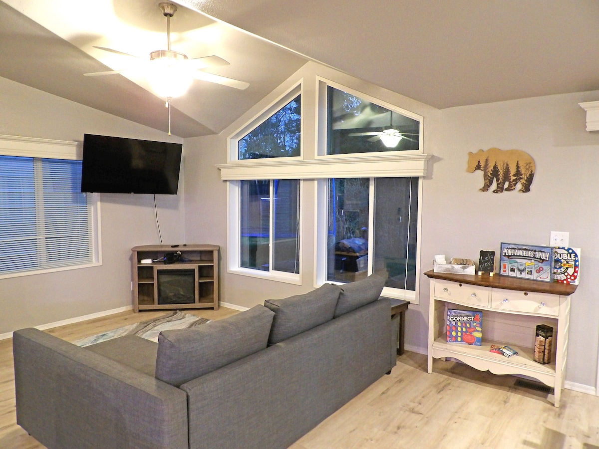 While our outside yardwork is on pause our inside is ready to welcome you! We are centrally located on a quiet street, close to many amenities. Enjoy easy access to Olympic National Park, Hurricane Ridge, Lake Crescent, the Pacific Coast and all that the Olympic Peninsula has to offer you. Our house offers 2 full-size bedrooms, with a queen bed & Roku Smart Tv's in each room, a cozy living room with a pull-out twin ottoman and a great front porch to view the Straits of Juan de Fuca.
