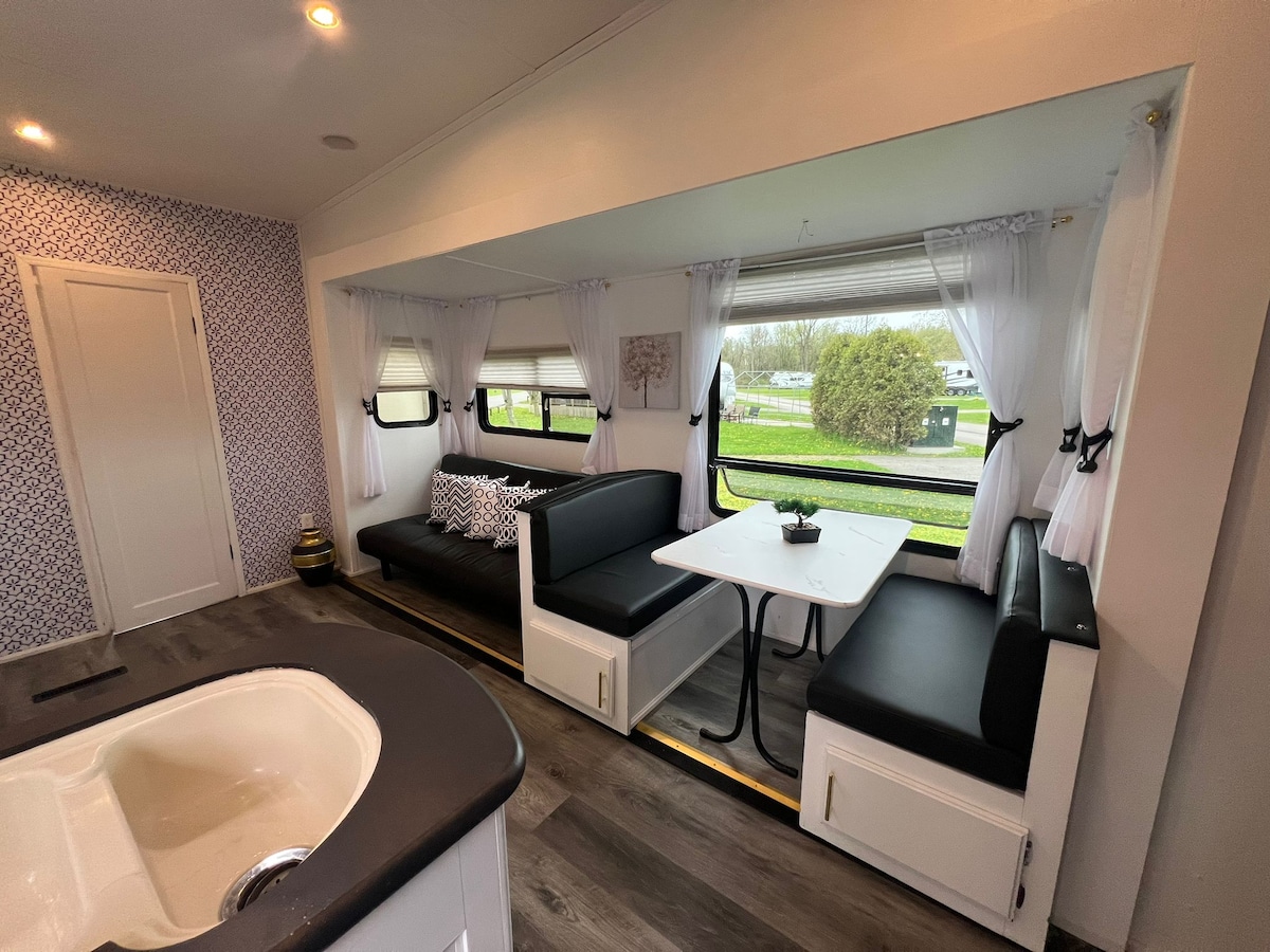 You'll love this unique and romantic escape. Perfect for a couples get away or a family adventure. With being central to many attractions such as the beach( 5 minutes away) close to Niagara Falls (30 minutes away) Safari Niagara (20 minutes away) nature trails (5 minutes away) and tons of wineries ( 30 minutes away). You won’t get bored. This clean well kept stationary RV sleeps 6 comfortably, has 1 full bathroom and one half bathroom for extra convenience. Towels sheets and pillows provided.