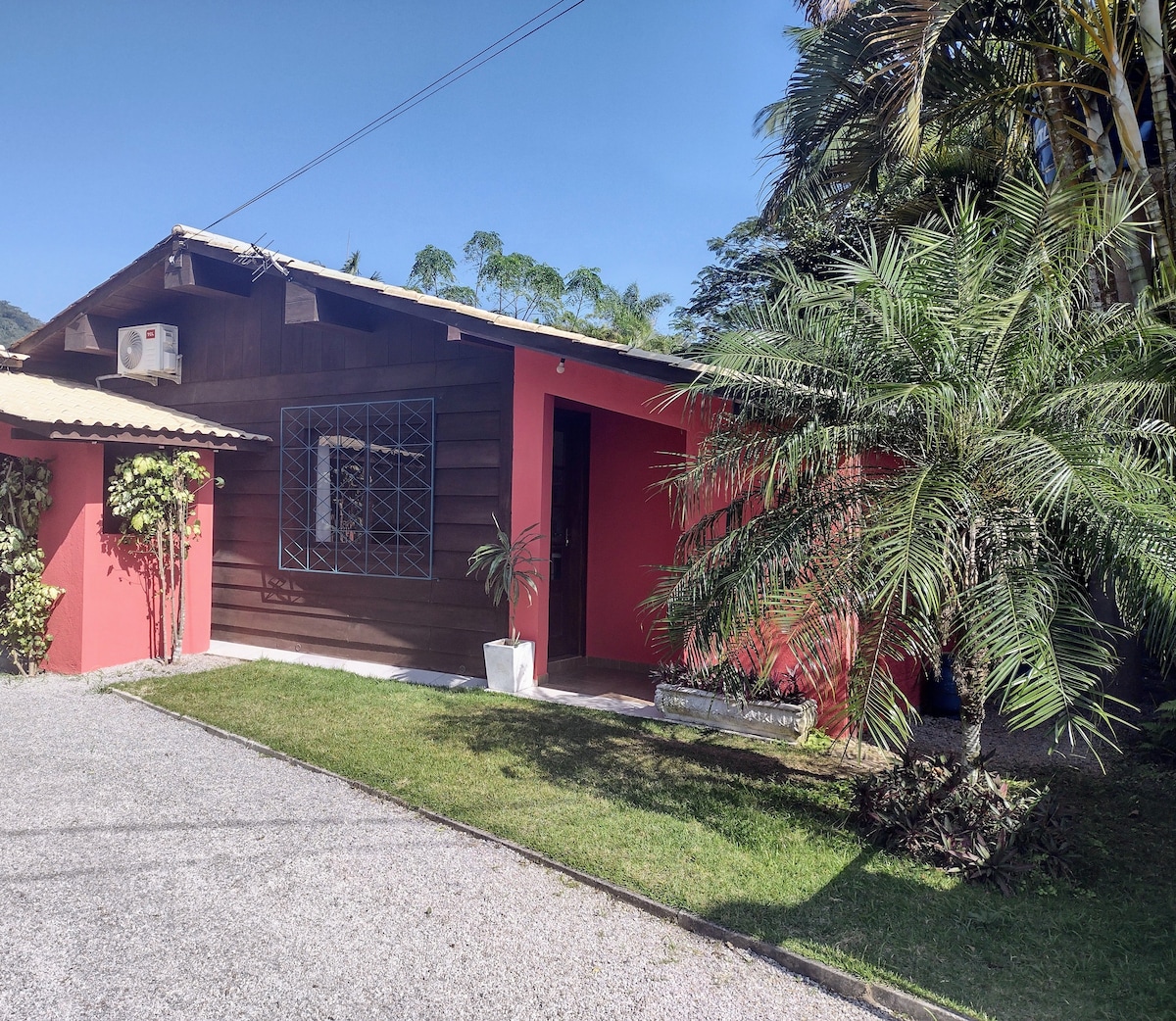 Um lugar em contato com a natureza e vista para o mar localizado a 400 metros da praia. Tranquilo e seguro onde é possível acordar com o canto dos pássaros. A casa dispõe de 1 dormitório suíte de casal, sala e cozinha integradas com sofá-cama para 2 pessoas, Smart TV, ventilador de teto e ar condicionado. Possui varanda com churrasqueira e uma linda vista para o mar e a Ilha de Porto Belo. Conta com estacionamento/vaga para 1 carro na frente dos chalés.