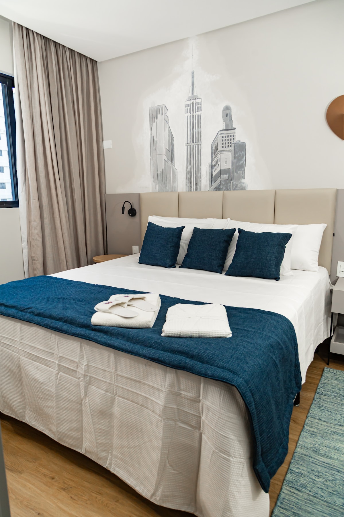 Flat em hotel 5 estrelas ⭐⭐⭐⭐⭐ O apto ocupa espaço no mesmo edifício de um hotel, porém, não temos serviços de hotelaria como troca de roupa de cama ou toalhas. Toda a área de lazer PODE SER USUFRUÍDA pelos hóspedes (como academia, spa, restaurantes, piscina) - 1 quarto de casal (roupa de cama e banho inclusas) - 1 vaga de garagem para carros grandes - 1 Banheiro c/ secador de cabelo - Sala c/ sofá-cama, TV e mesa para 4 pessoas - Cozinha completa - Café da manhã no hotel disponível à parte