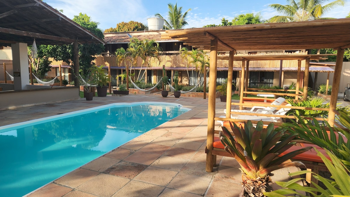 Chalé aconchegante a menos de 5 minutos de caminhada da rua mais charmosa do Brasil a Rua do Mucugê, praias e conveniências. Estamos preparado para proporcionar para você férias únicas aproveitando todos os momentos da histórica Arraial d'Ajuda. Todos chalés completo com cama de casal, camas de solteiro, ar condicionado, banheiro privativo, varanda com rede e cozinha completa(geladeira, fogão e utensílios). Ambiente tranquilo com conforto e qualidade.