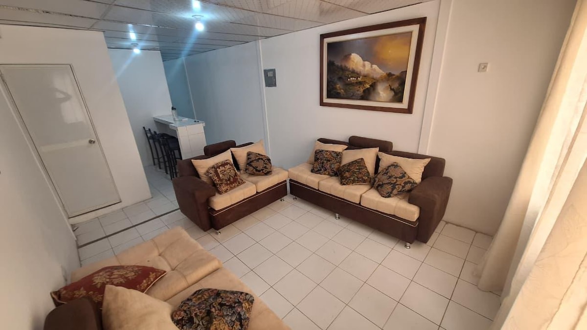Desfrute de uma experiência elegante nesta suíte localizada em frente ao shopping center mais importante da cidade. Uma área segura com todas as instalações a poucos metros de você. 1 quarto principal com banheiro privativo Sala de estar/jantar com banheiro de hóspedes. Sofá-cama Pátio com rede Geladeira e cozinha completa. Smart Tv A/C Área de estacionamento privativa gratuita Farmácias e áreas comerciais muito próximas Perfeito para casais ou viajantes individuais que buscam conforto e uma localização privilegiada.