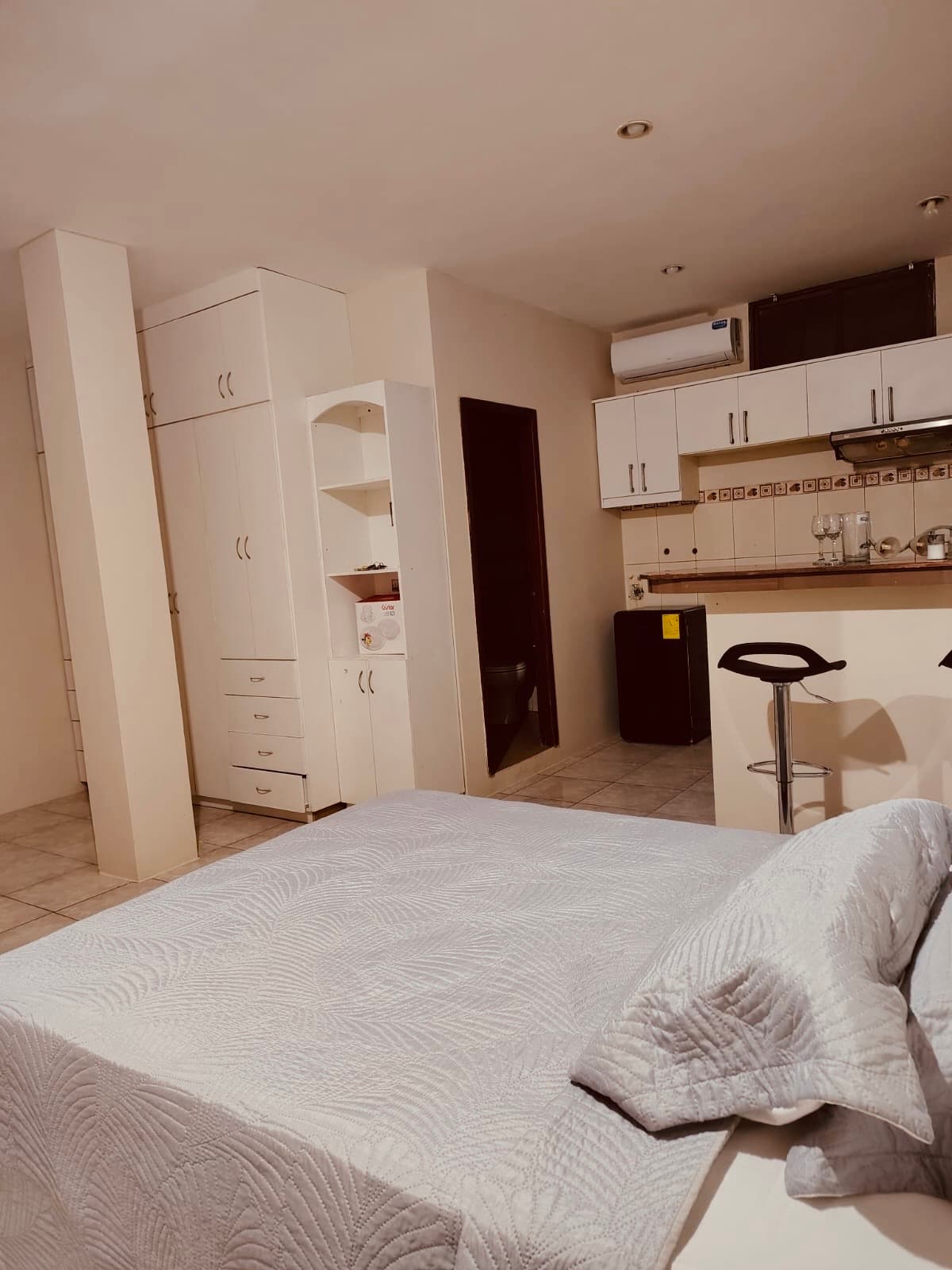 Este apartamento-suíte com varanda privativa está estrategicamente localizado no coração de Portoviejo, perto de tudo! Ele fornece um espaço completamente PRIVADO para VOCÊ e é muito seguro no primeiro andar do edifício. Você pode ficar no centro de Portoviejo a poucos metros do Shopping Center, perto de parques e ir a qualquer lugar da cidade em poucos minutos. Além de descansar confortavelmente, você também terá uma mesa de trabalho com internet rápida.