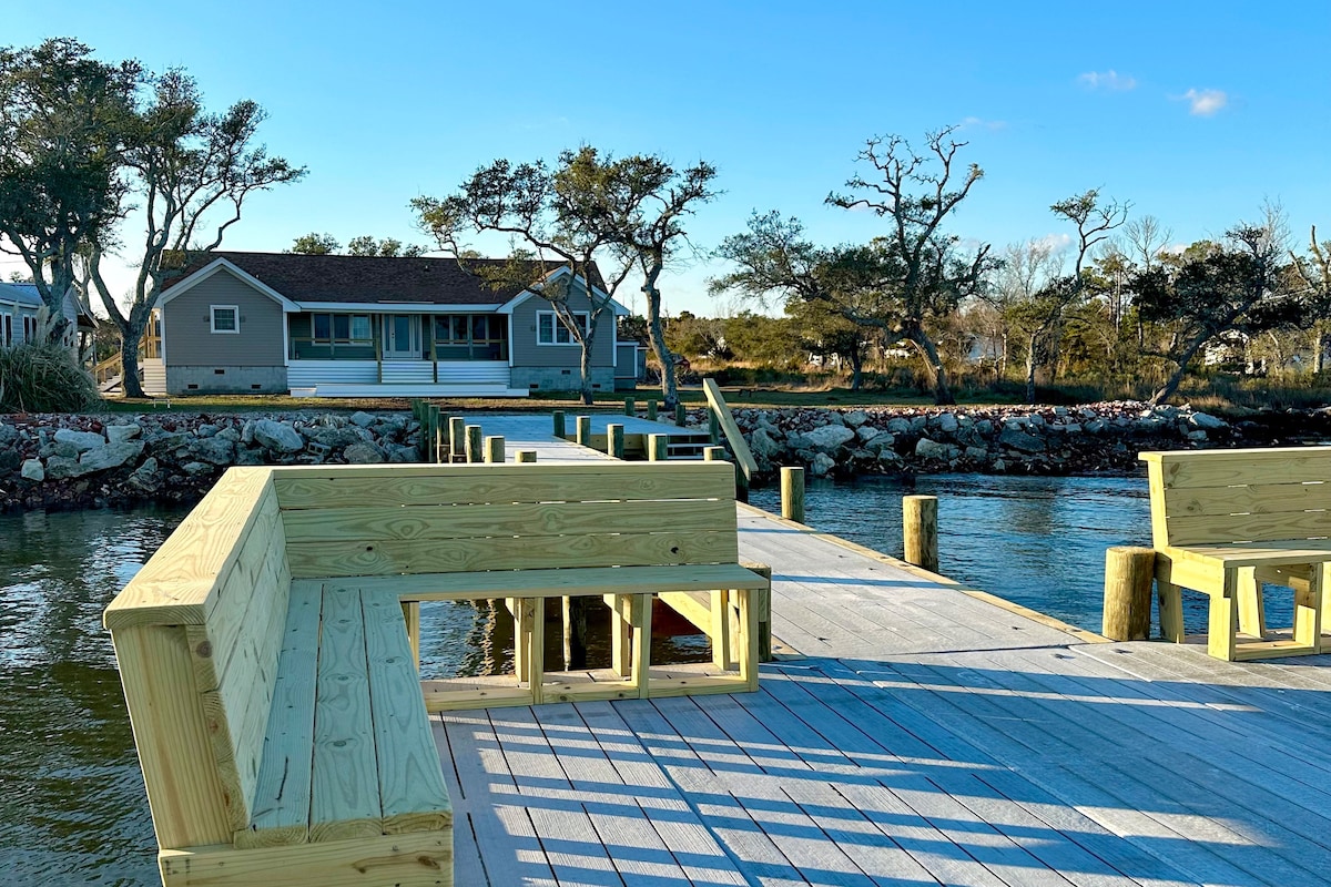 *Vista deslumbrante para a água ao nascer e pôr do sol *Varanda de 3 estações com solário. *Vista para a Jarrett Bay. * 2 camas, 2 banheiros. Acomoda até seis pessoas. * Lance seu próprio barco ou caiaque ou alugue do outro lado da rua * Localizado a 15-45 minutos de Beaufort, Atlantic Beach, Shackleford Banks, Cape Lookout, Aquário da Carolina do Norte * Sala de jogos, pingue-pongue, pebolim, jogos de quintal * Cadeiras de praia, guarda-sol * Ótima localização para quem gosta de praia, caçadores de patos, pesca no Cabo Lookout *Lareira externa