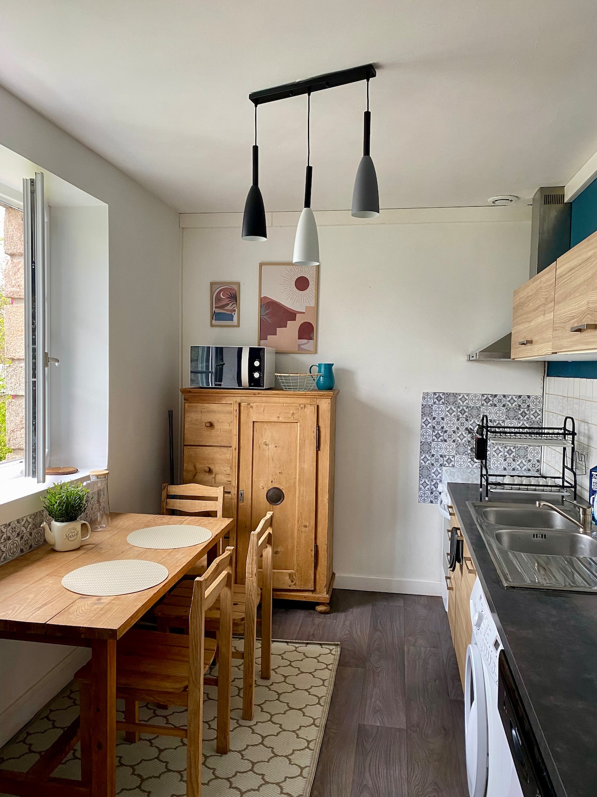 Je vous accueille au rdc de ma maison située au coeur du quartier historique d'Aubusson. C'est un logement chaleureux de 30m2 avec cuisine et salon. La cuisine équipée donne sur une petite cour privative. Le salon peut accueillir 3 personnes, avec un lit double en 140 et un lit simple, le wifi et la télévision. La salle de bain du rdc est privative au logement mais se situe en dehors de la pièce à vivre, seuls les w-c à l'entée de la maison sont en commun.