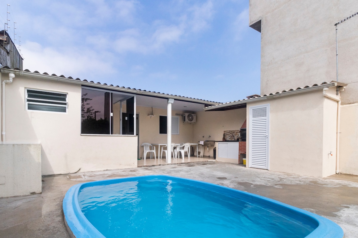 Casa estilo sobrado, composta de quarto, sala, cozinha e banheiro. Área externa com piscina e churrasqueira. localizada a 10 minutinhos a pé da praia da Enseada, ótimo espaço com piscina para curtir após a praia. E ainda aproveita o acesso fácil a tudo o que precisar, como restaurantes, baladas barzinhos, mercados e etc. ATENÇÃO voltagem: 220W 2 hóspedes por vez Casa não compartilhada não aceitamos pets trazer roupa de cama e banho check-in até as 18 flexibilidade depende da ocupação.