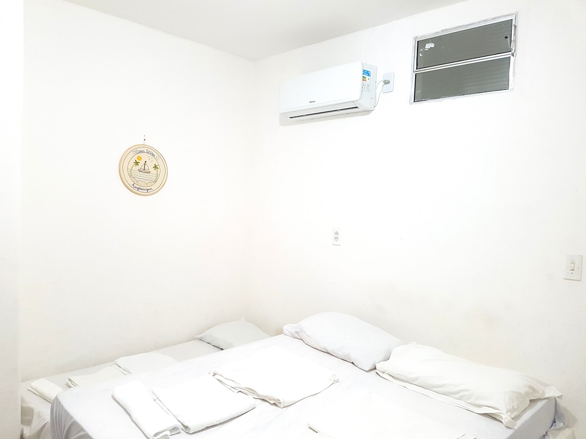 Suíte completa, com ar-condicionado, cama casal e cama solteiro, banheiro privado.