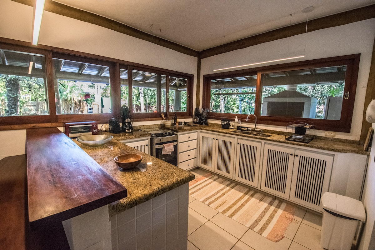 A casa foi construída pela gente há 35 anos =) Fazemos apenas locações de curto prazo para movimentar e casa. A casa tem 3 quartos, uma delas suíte. 3 banheiros, sendo 1 externo. Cozinha completa, anexada a sala de estar com paredes de vidro. Bastante área externa com redes, forno de pizza, churrasqueira. Acessórios de praia, como cadeiras e guarda-sóis estão disponíveis.