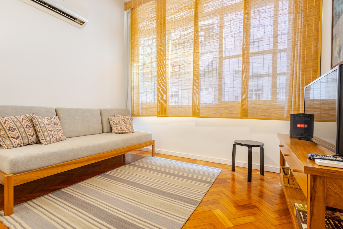 Apartamento localizado no coração do Leblon, iluminado e ventilado, modernizado, 3a. Quadra da praia, 3 minutos a pé, perto do metrô, ao lado de ótimos restaurantes, supermercados e comércio. O espaço possui uma cozinha americana, área externa com chuveiro, quarto com cama de casal padrão e armários, além de outro quarto com escrivaninha para 2 pessoas e sofá-cama de casal, um banheiro, wi-fi, ventilador de teto na sala e no quarto de casal, ar-condicionados split, TVs Smart, portaria 24 h.