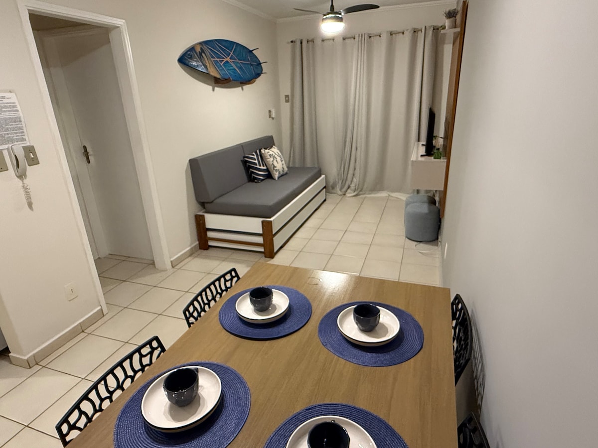 Apto duplex com 1 dorm, duas sacadas (na sala e outra maior no quarto). Cozinha bem equipada para preparar refeições e para comer. Ar condicionado no QUARTO, Wi-Fi de 600 megas, smarttv 50” UHD. Ótima localização, a 3 min. da praia indo a pé (veja nas fotos). Uma vaga de garagem dentro do condomínio com portão eletrônico. Lugar aconchegante, muito limpo…ambiente familiar. ➡️ Obs: Não fornecemos roupas de cama e banho. ➡️ Neste apto não tem forno. ➡️ Atenção as regras da casa.