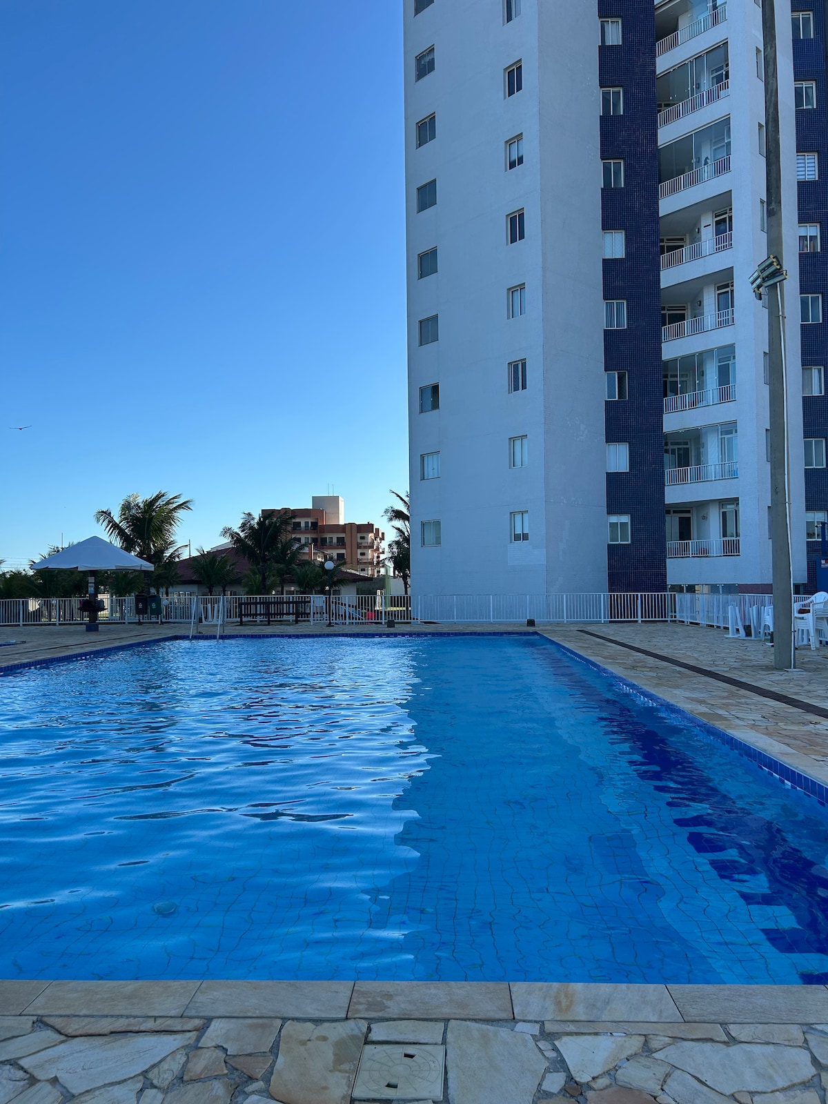 Divirta-se com a sua família neste lugar cheio de estilo, novinho e cheiroso bem próximo à praia. É um espaço bem equipado com 2 quartos com ar condicionado, um banheiro, máquina lava e seca, camas aconchegantes, roupas de cama, toalhas e utensílios de cozinha, tudo para momentos de conforto e descanso. Espaço para suas crianças brincarem e se divertiram na piscina ou em quadra de esportes. Academia com esteira e bicicleta ergométrica. Banheiros auxiliares na área da piscina que ficam próximos.