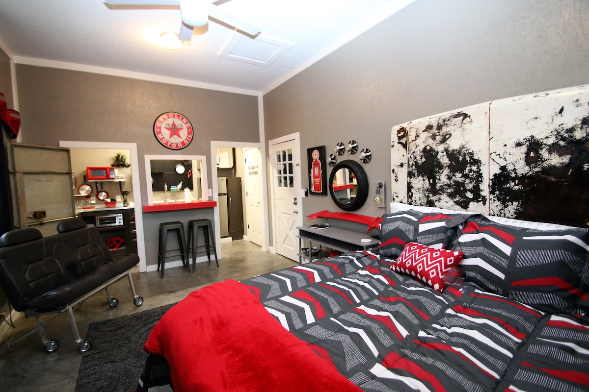 Oz Landing - DT Rogers Lower Level Studio is a NEW construction Carriage House built in late 2021 with a PRIVATE ENTRANCE and dedicated parking. The inside has 1 queen bed with a pull out sofa, TV with streaming to your favorite aps, secured bike storage with SARIS racks, hot and cold bike wash, fire pit, patio with seating, and only 2.8 miles to Beaver Lake, walking distance to DT Rogers, only minutes to Bentonville, and the U of A! ASK about E-BIKE RENTAL AVAILABLE!