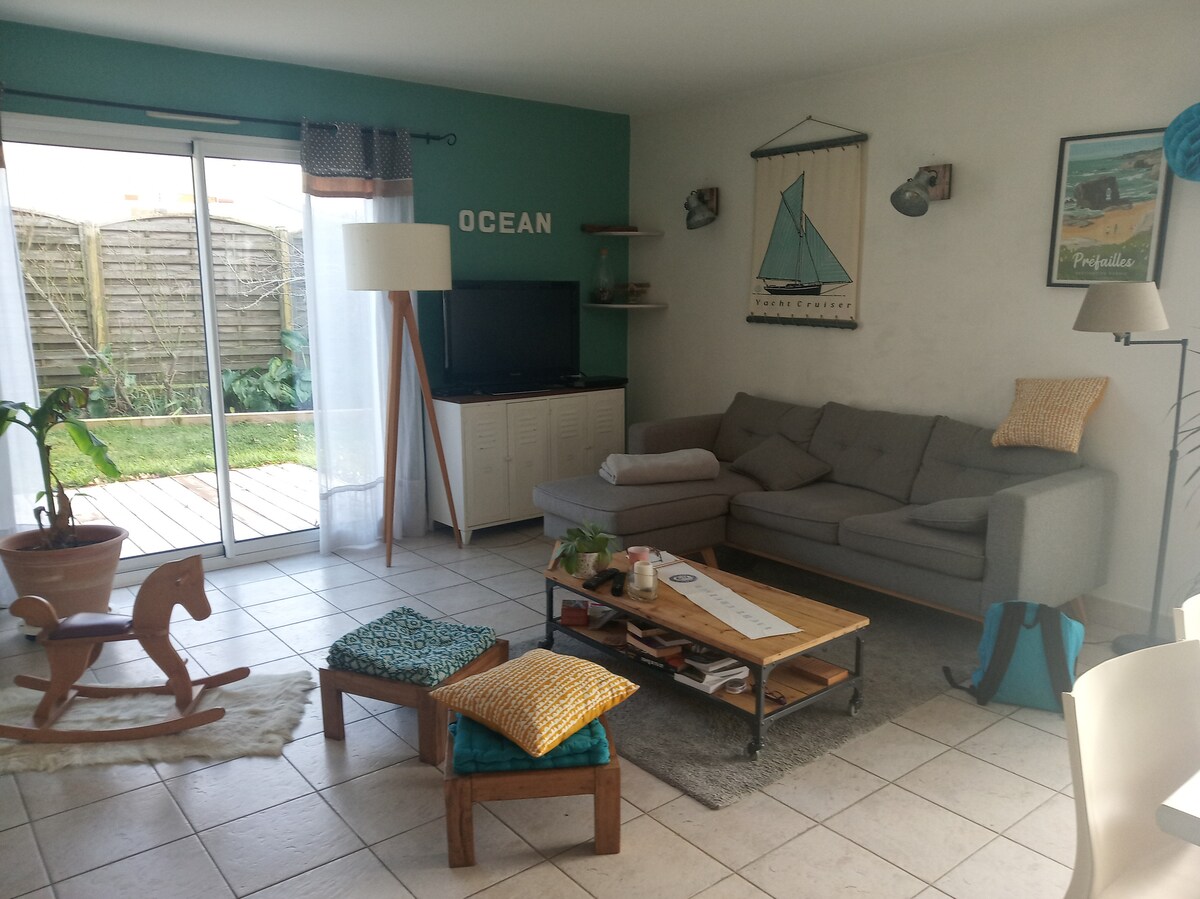 Casa de 90 m2 com terraço e jardim, A 3 minutos do mar e a 5 minutos do mercado. Casa disponível durante todo o ano, exceto em Agosto. Localizado em Préfailles, uma pequena aldeia familiar onde você pode ter uma estadia tranquila e pacífica (praia, caminhada, pesca, vela, surfe). Um caminho costeiro leva você ao porto de Pointe Saint Gildas. Em frente, a ilha de Noirmoutier, onde é possível chegar de estrada ou barco. Uma hora de Nantes, La Baule, Guérande, 30 minutos de Saint Nazaire, 10 minutos de Pornic.