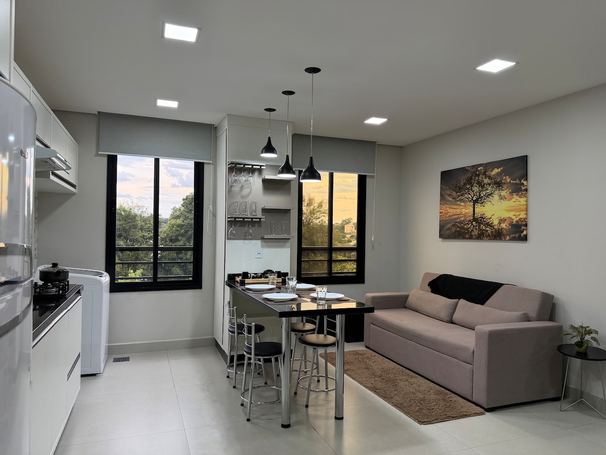 Abrace o aconchego neste lugar projetado com muito cuidado e carinho! Recém finalizado no centro de Foz, perto de tudo o que você precisa para que sua hospedagem seja perfeita. Andando você encontra supermercados, restaurantes, farmácias, posto de combustível, bancos, casa lotérica, cafés, bares noturnos, etc Espaço composto por uma suíte confortável, lavabo, sala de estar/tv/jantar, unificados com uma cozinha compacta e funcional, Na sacada você conta com uma mesa para desfrutar por do sol!
