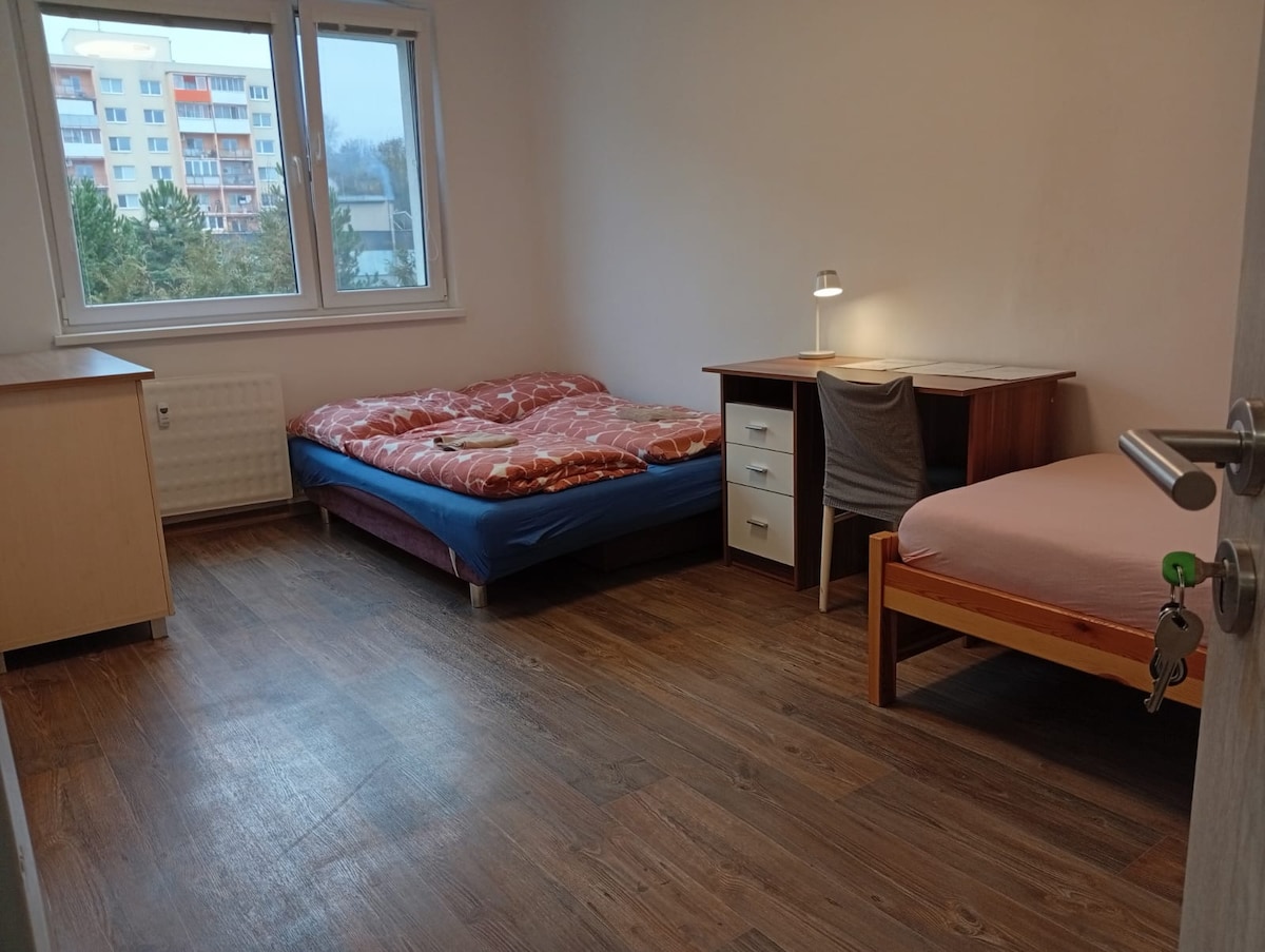 Táto svetlá, súkromná a uzamykateľná izba s kapacitou do 3 osôb (1 manželská posteľ + rozkladacia pohovka) sa nachádza v tichej lokalite. Hostia majú prístup k zdieľanej kuchyni, kúpeľni a WC, ktoré sú spoločné s druhou ubytovacou jednotkou na chodbe. Posteľná bielizeň a uteráky sú v cene. Kuchyňa je plne vybavená. Kúpeľňa so sprchou. Izba je nepriechodná a uzamykateľná. Zákaz fajčiť v celom objekte. V objekte nebýva hostiteľ. Prístup je cez kód alebo osobné odovzdanie kľúčov.