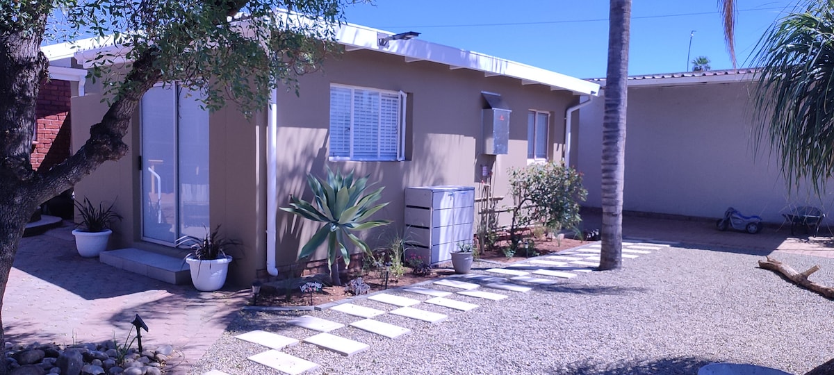 We would love you to stay in our Karoo Country Style cottage. Situated in a corner of our spacious garden with a large swimming pool. Sun-facing terrace with bench and table and chairs. Our property has an inverter, which makes loadshedding less of a problem. Secure parking on the property. There is a most convenient Spar just 'around the corner' 5 minutes walk. 3 minutes from the town center. 1 Minute from the:- N. A. Smit Swimming Pool De Jagers Sport Complex Oudtshoorn Bowling Club.
