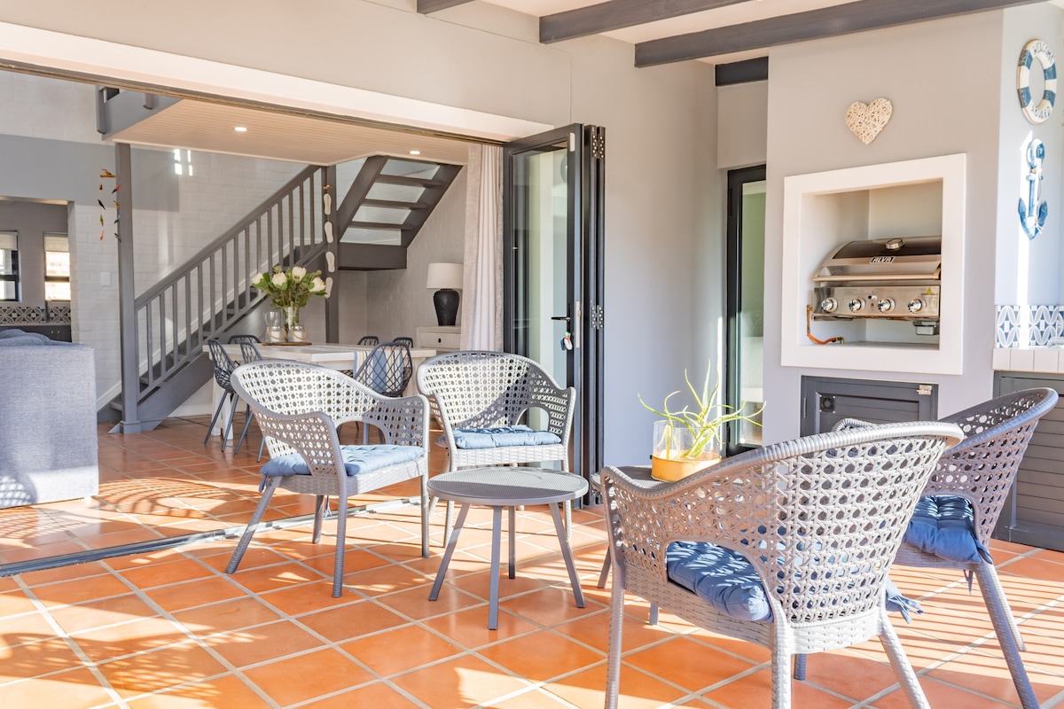 Our home is perfectly situated in the heart of the Town, only 200m from the shops and bars and 300m from the main beach walkway. It is nestled on a small elevation with tremendous views of the coast and mountains. The house is recently renovated and we are now solar powered with mains back-up. There is a large braai room with seating for 10 people - where it all happens!