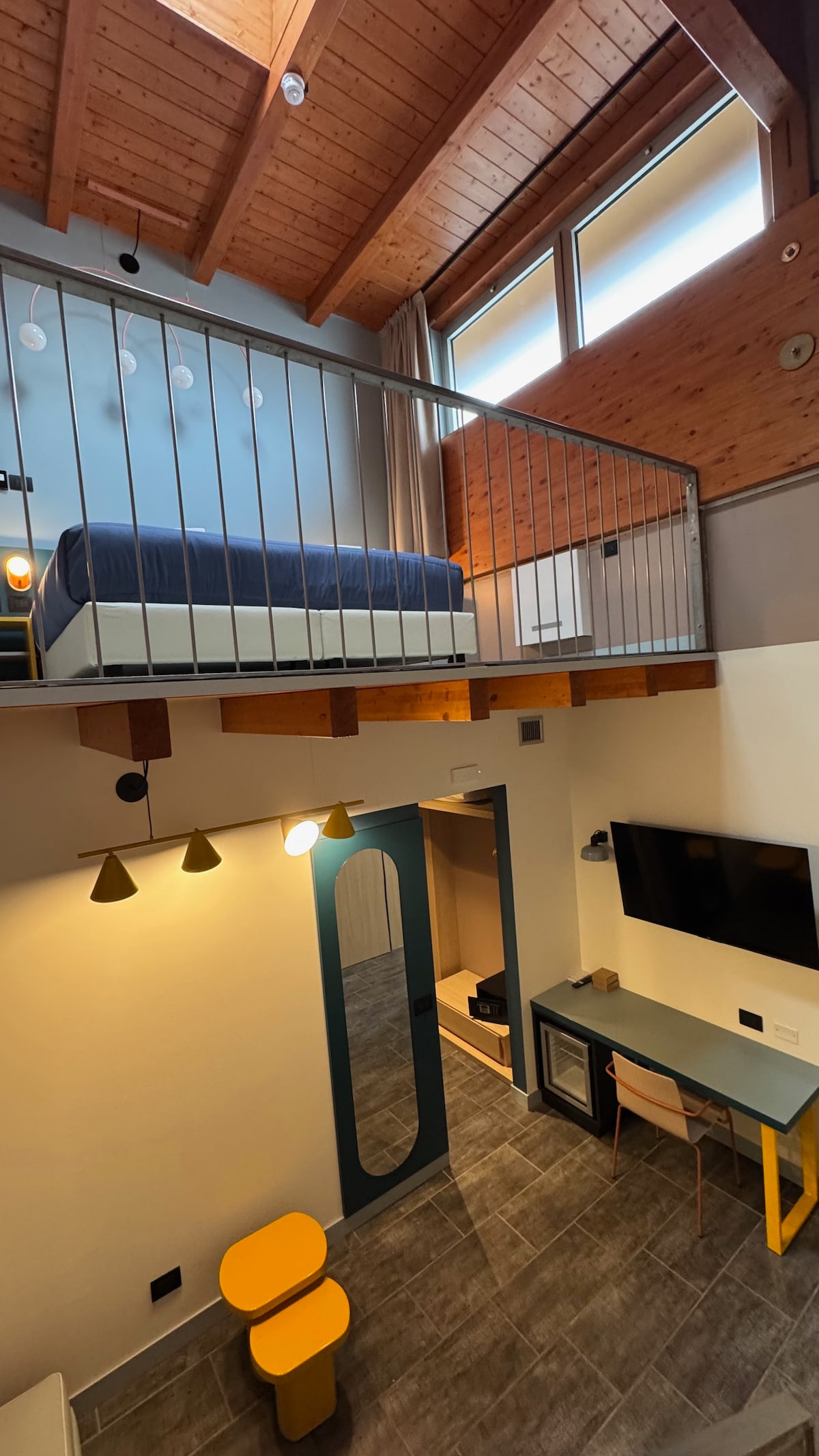 Camera Loft disposta su due livelli, ideale per chi cerca comfort e stile. Hotel e camera completamente nuovi, con arredo moderno e funzionale. Dotata di super connessione internet, climatizzazione con sistemi di ultima generazione e Smart TV a parete. Elevati standard di sicurezza garantiscono un soggiorno confortevole, rilassante e senza pensieri.Lo stile di questo spazio fa da sfondo trendy al tuo soggiorno.