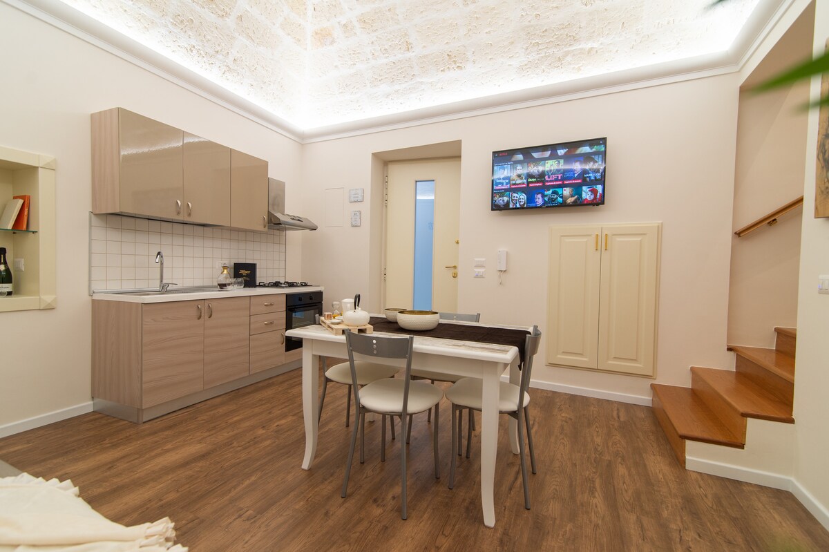 Apartamento estúdio, finamente renovado em estilo barroco, no coração do centro histórico de Martina Franca. Possui todos os confortos necessários: cozinha completa com louça, geladeira e placa. Claro, uma cama de casal, com a opção de adicionar um sofá-cama para outras duas pessoas, completo com roupa de cama. O banheiro tem tudo o que você precisa, incluindo um kit de toalha à sua disposição por pessoa. O quarto tem ar condicionado e lareira.