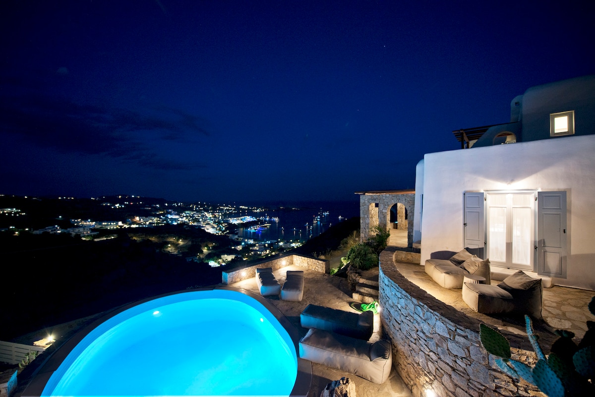 Faz parte de um complexo de vilas distintas e elegantes com vistas panorâmicas deslumbrantes de Delos,Naxos,Paros e do Egeu. Tem uma vila de dois andares e pode acomodar até 6 pessoas, pois é composta por 3 camas de casal king-size. Tem banheiros de 3 suítes, uma cozinha totalmente equipada, ar condicionado em todos os quartos, uma sala de estar elegante e espaçosa, uma piscina privativa de 35 m ², um terraço privativo de 180 m ² e um estacionamento privativo.