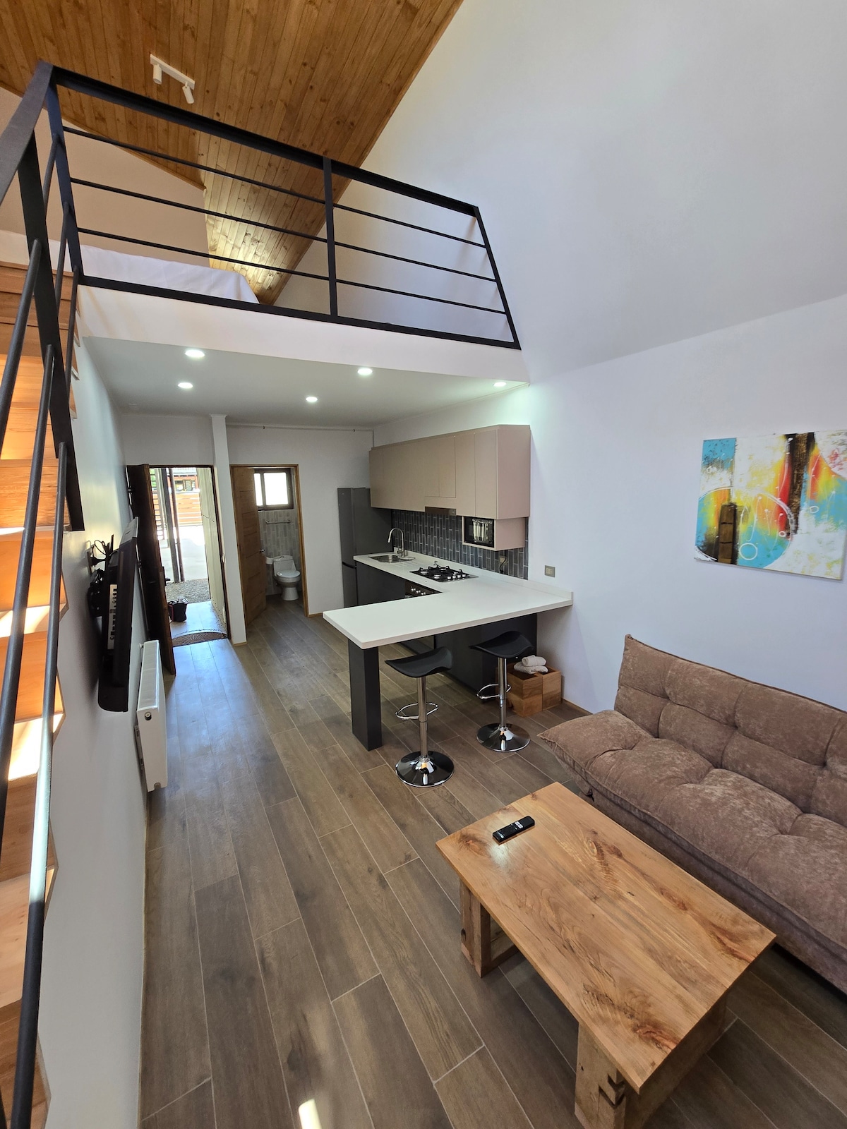 Estúdio novo e aconchegante na melhor localização de Pucón, a poucos passos da praia grande, do centro e isolado do barulho da rua principal. Possui uma cama de casal, um futon de casal, cozinha totalmente equipada, banheiro completo, Wi-Fi, TV 49" com Netflix, Disney+ e muito mais, terraço, aquecimento, churrasqueira, cafeteiras, 2 bicicletas de uso ilimitado, entre outros. Estacionamento público em frente ao acesso ao edifício disponível. Inclui roupa de cama, toalhas e suprimentos básicos de banho e cozinha para cada estadia.