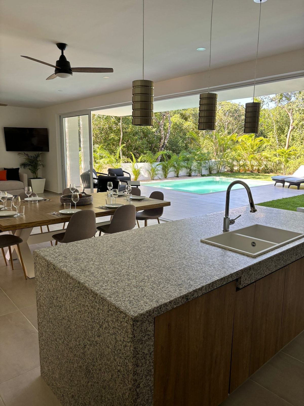 Luxury villa nestled in the jungle, just minutes from Xpu-Ha beach and the exclusive Xlmar beach club (entrance fee 250 pesos, 200 refundable in food and drink). Five minutes from Puerto Aventuras, 20 km from Playa del Carmen, 38 km from Tulum, and 85 km from Cancun airport. Secure complex with 24-hour double surveillance, swimming pools, gyms, sports fields, and relaxation areas. An oasis of tranquility and comfort. A car is recommended.