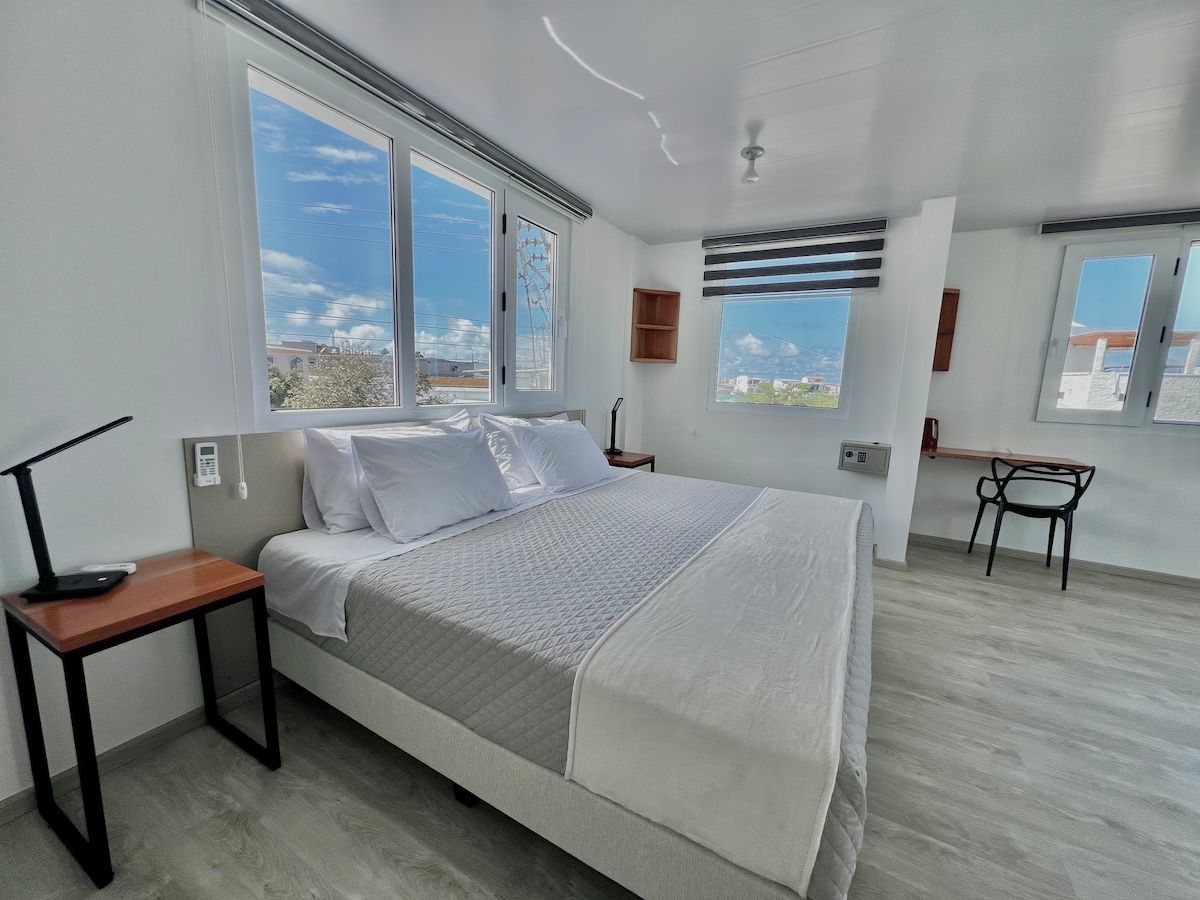 Relaxe neste lugar único e tranquilo! Localizadas nas Ilhas Galápagos, um dos lugares mais bonitos do planeta, nossas acomodações oferecem o máximo de conforto adaptado às suas necessidades. Escolha entre uma cama king-size ou duas camas de solteiro, ajustadas à sua preferência pessoal. O quarto possui banheiro privativo, escrivaninha e frigobar. Desfrute de espaços abertos com piscina, garantindo que sua visita às Galápagos seja verdadeiramente inesquecível.