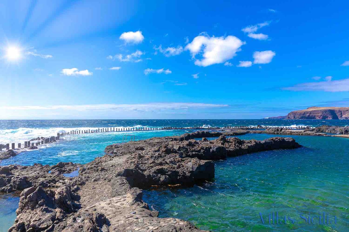 Um apartamento inteiro com piscina compartilhada, terraço próprio e solário. A cinco minutos a pé da praia, excelentes vistas panorâmicas, em um dia claro, da ilha vizinha de Tenerife e seu pico, El Teide. Ideal para quem gosta de ficar longe da agitação das áreas turísticas. Por favor, leia como chegar ao apartamento na seção Como se locomover para que você possa avaliar como chegar lá, é recomendável alugar um carro.