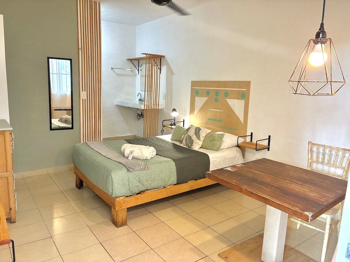 "Coração de palapa" ideal para casais aventureiros com gosto pelo simples e conforto ao máximo com todos os serviços king size, kitchenette, a/a, Wi-Fi de velocidade, design único e um grande terraço onde pode desfrutar de um livro na rede ou de uma grande variedade de serviços holísticos que tornarão as suas férias uma experiência única e acolhedora para a sua alma. Viva a liberdade de se mover com segurança e rapidez a apenas 10 minutos do centro da cidade em transportes públicos, bairro seguro e familiar.