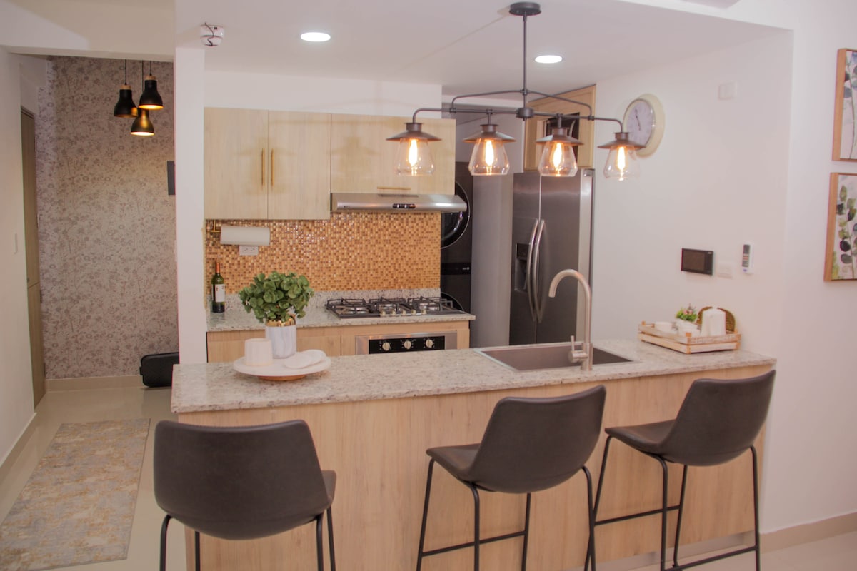 Este novo apartamento é a estadia perfeita para uma viagem em família e com amigos. Está localizado a 10 minutos do Aeroporto de Santiago, repleto de comodidades e totalmente mobiliado. Há 3,5 banheiros, 3 quartos com A/C e um quarto de hóspedes com uma cama de solteiro, ventilador e seu próprio banheiro. Cozinha totalmente equipada, duas salas de estar, A/C, duas Smart TV de 50”, alto-falantes Bluetooth e duas vagas de estacionamento. Você também pode desfrutar dos arredores do complexo, como o parque infantil, piscina, sala de eventos, lago e quadra esportiva.