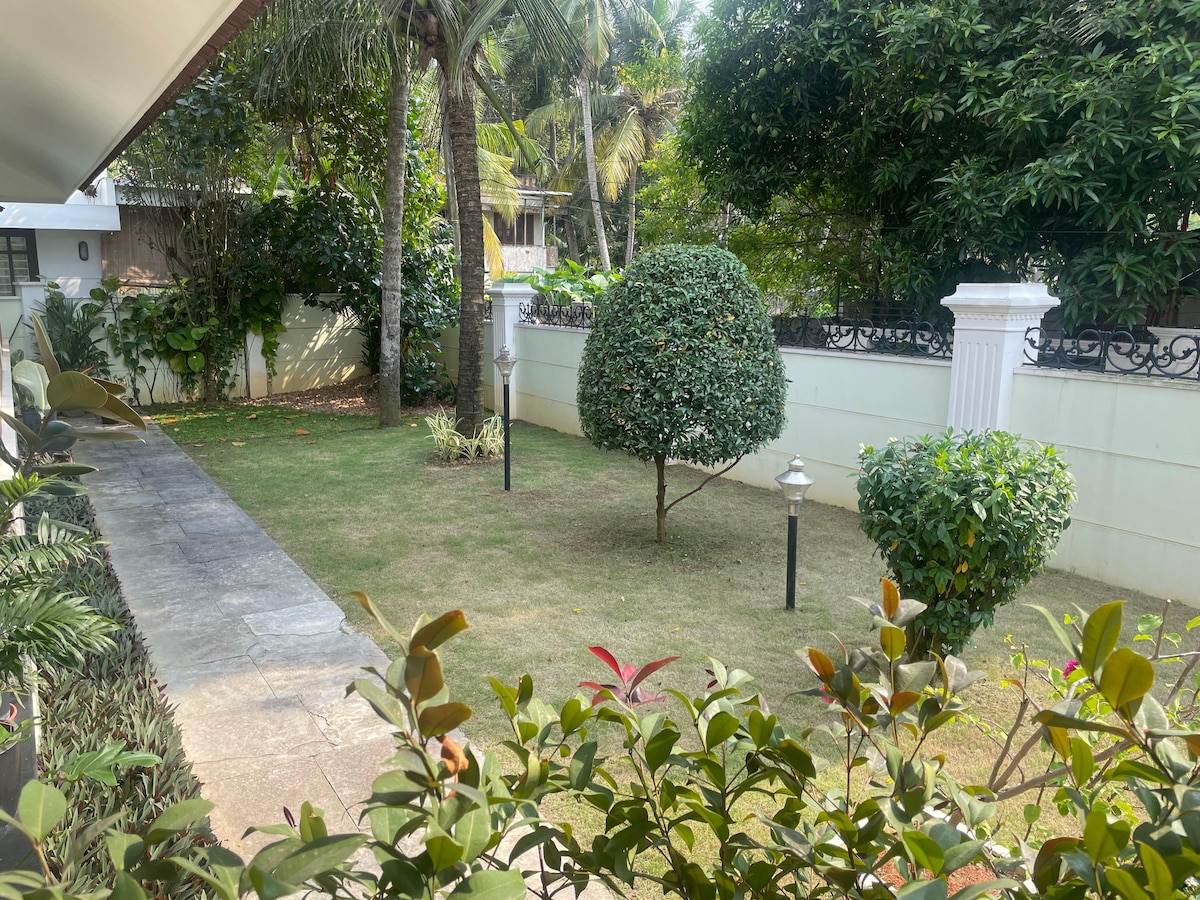 Just 2 km from the shore, this spacious home features a BBQ area, outdoor dining, lush greenery, and a kids' pool. Inside, enjoy well-lit rooms with attached bathrooms, a cozy dining area, and dual kitchens. The master suite includes a private tub for ultimate relaxation. Safe, comfortable, and perfectly located for beach access and local attractions, this haven is ideal for family and friends looking for a memorable getaway. Book now for a blend of comfort and adventure!