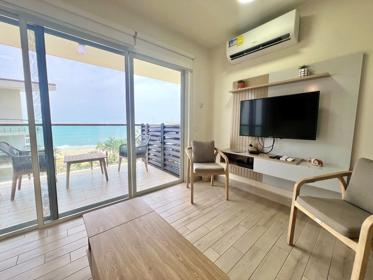 Apartamento à beira-mar com cama king size e comodidades de hotel
