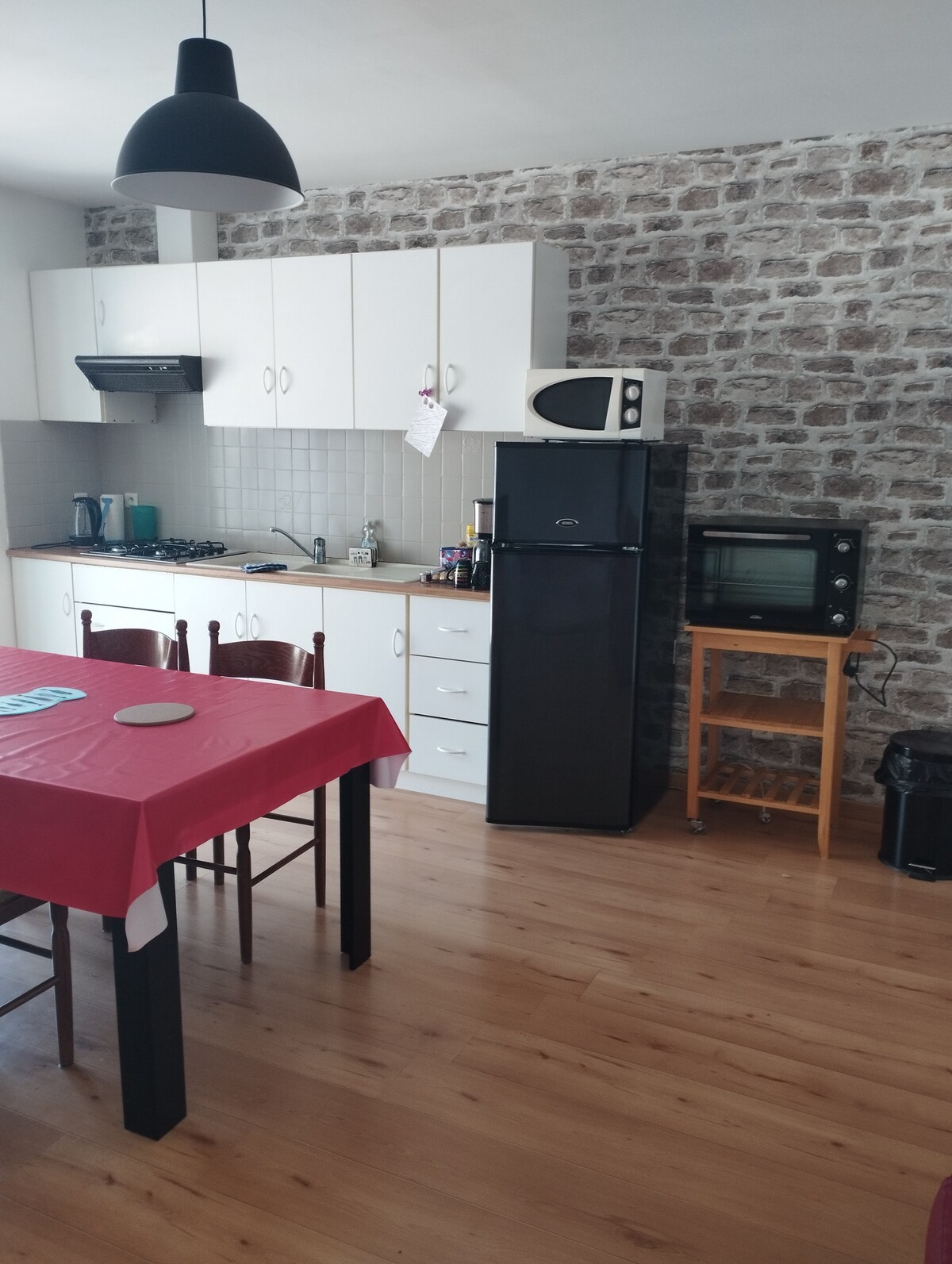 Para suas férias ou viagens de negócios, casa de campo para alugar. No piso térreo, a casa tem uma cozinha aberta para a sala de estar/jantar. Equipamento: geladeira, microondas, fogão, mini forno E itens básicos DE cozinha. Você também encontrará, neste nível, o banheiro com um chuveiro e a máquina de lavar roupa, bem como um vaso sanitário separado. No andar de cima, você terá dois quartos com camas de casal e um espaço aconchegante e relaxante com dois