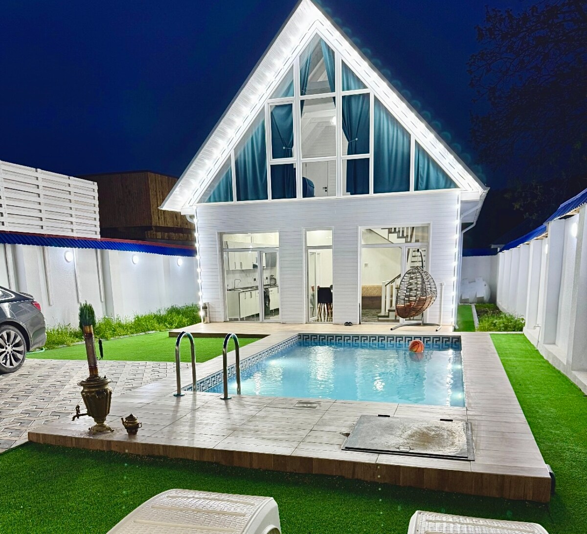 No quintal mais rosas, árvores, pérgola (беседка) para uso diário e noturno. Tamanho do balanço para duas pessoas - adulto ou criança. Na taxa, inclua braseiro (мангал) para kebab e samovar de carvão para fazer chá tradicional. Na casa existem gamão (нарды) e dominó.