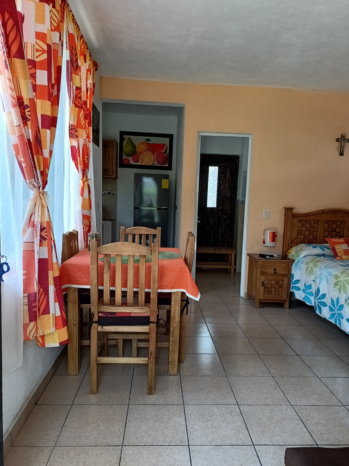 NÃO ESTAMOS NO CENTRO DA CIDADE Suíte privativa pequena, mas aconchegante, com cozinha, banheiro e vaga de estacionamento exclusiva, itens básicos para uma estadia agradável em Tequisquiapan, em uma propriedade situada a 1,2 km da praça principal da cidade e a 4 quadras da estrada San Juan del Río-Xilitla. Não é um condomínio ou área residencial, é um bairro tranquilo. Você será nossa prioridade! “Ideal para duas pessoas, mas um terceiro hóspede pode dormir no sofá-cama.”