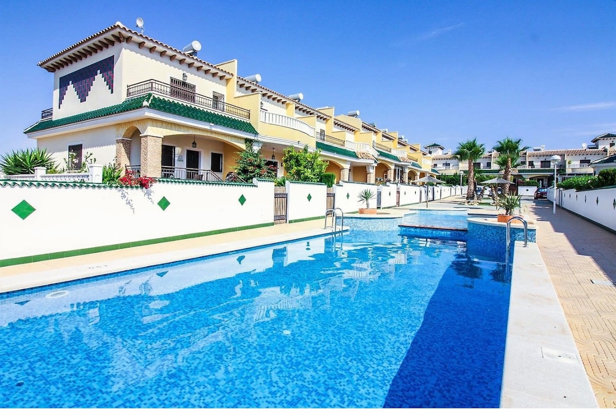 Esta encantadora moradia geminada de 2 quartos com 4 camas fica a apenas 5 minutos a pé de restaurantes, lojas e bares locais ou a 20 minutos a pé do centro de Ciudad Quesada. Com Wi-Fi, ar condicionado completo, terraço frontal e pátio traseiro com acesso direto às piscinas comuns fechadas e terrenos é a casa de férias perfeita. Primeiro andar - quarto duplo principal com terraço privativo, quarto duplo, banheiro principal. Piso térreo - Sala de estar e jantar, cozinha equipada, WC no andar de baixo.