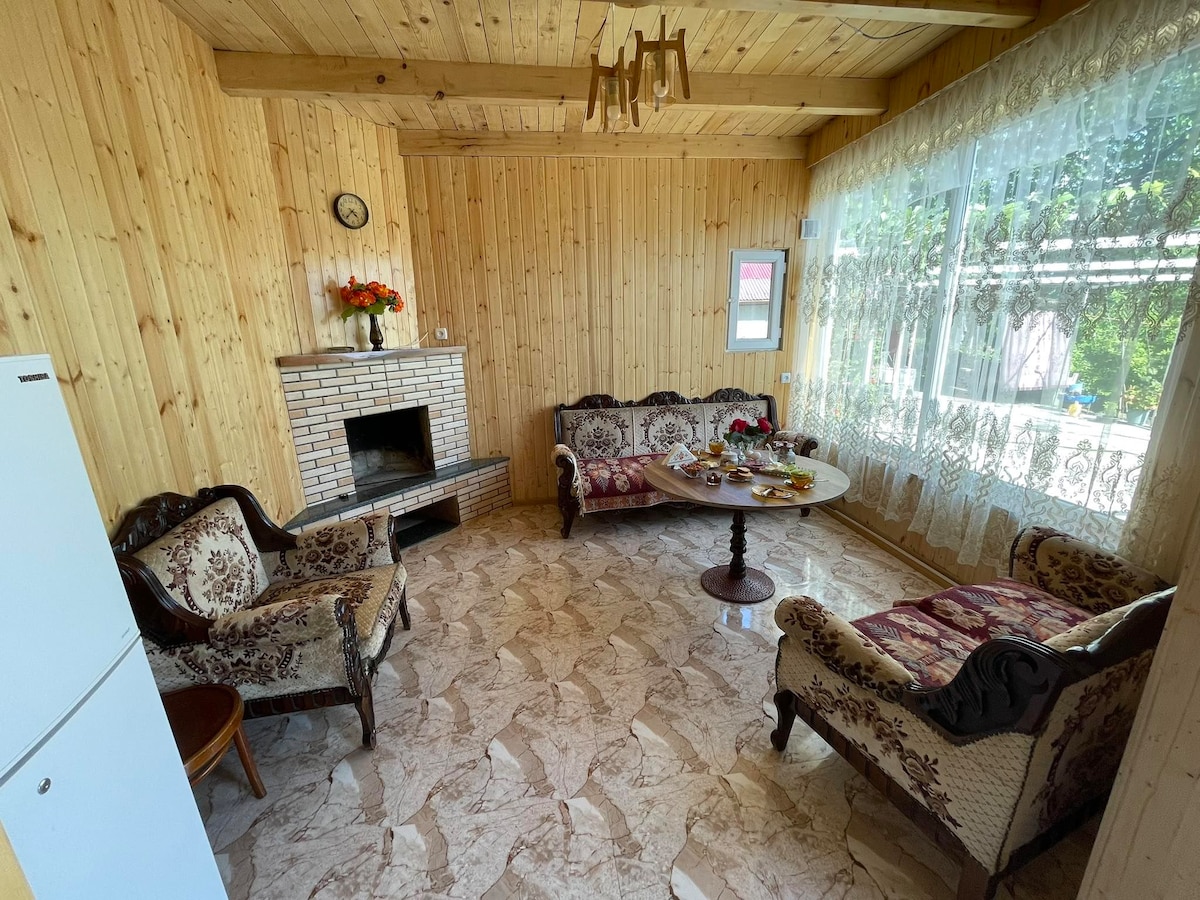 ambiente aconchegante, na natureza, cabana com quintal grande, lareira tradicional e elementos de tijolo, e confortos modernos, 2 aparelhos de ar condicionado, máquina de lavar roupa, Wi-Fi, TV, máquina de lavar roupa. a casa está localizada a 2 km da cidade, na fronteira de Lechkhumi-Svaneti, entre dois rios onde é possível nadar e pescar o melhor lugar para relaxar e recriar, o ar fresco, as vistas da floresta e das montanhas. um ótimo lugar para casais e famílias grandes.