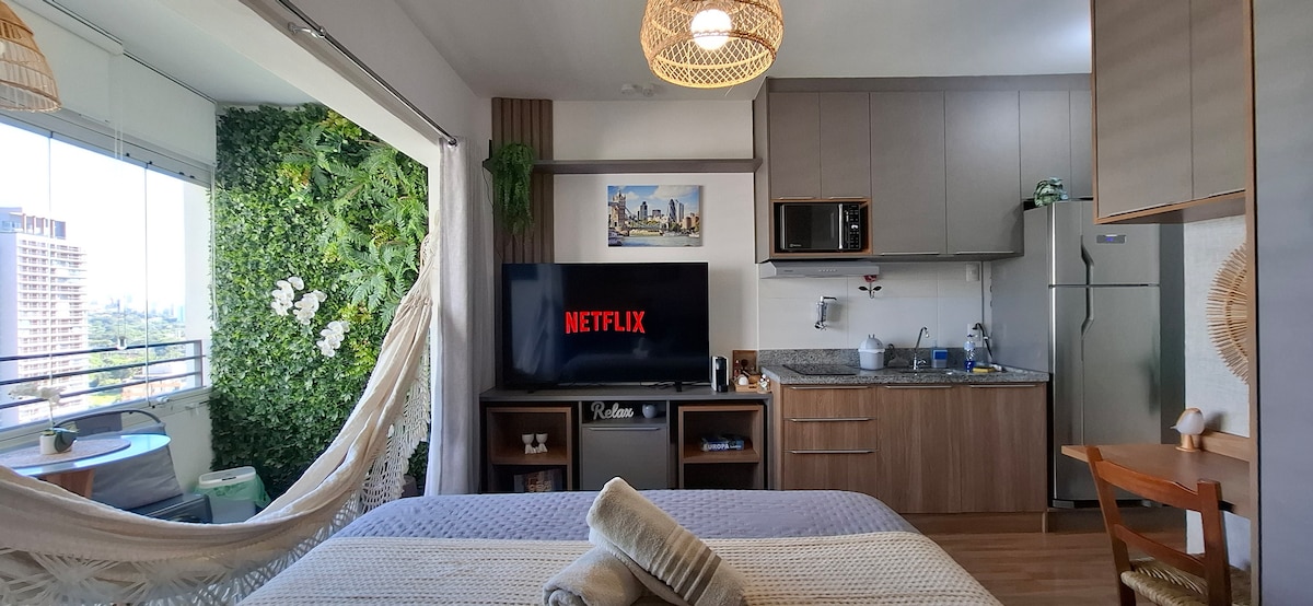 Relaxe neste espaço calmo e cheio de estilo. Preparado com muito amor e carinho para você se sentir em casa. Studio novo e com a localização perfeita, a poucos metros da estação de metrô butantã, além de estar bem próximo do shopping Eldorado, vila madalena e Pinheiros. Também possuimos estacionamento incluído na diária. O condomínio Verde Panorama oferece infraestrutura completa. Uma bela piscina no Rooftop, acadêmia, lavanderia, Co-working e lounge. #sóvem 🤩